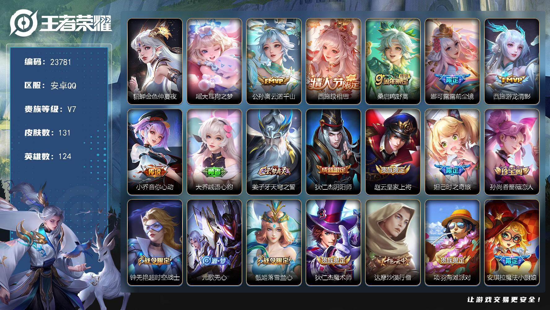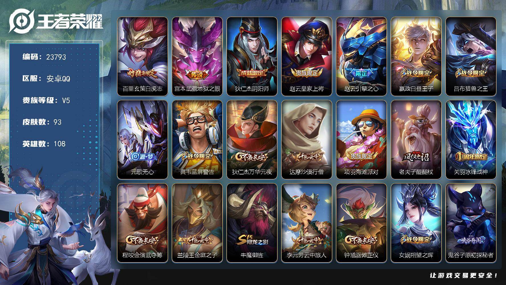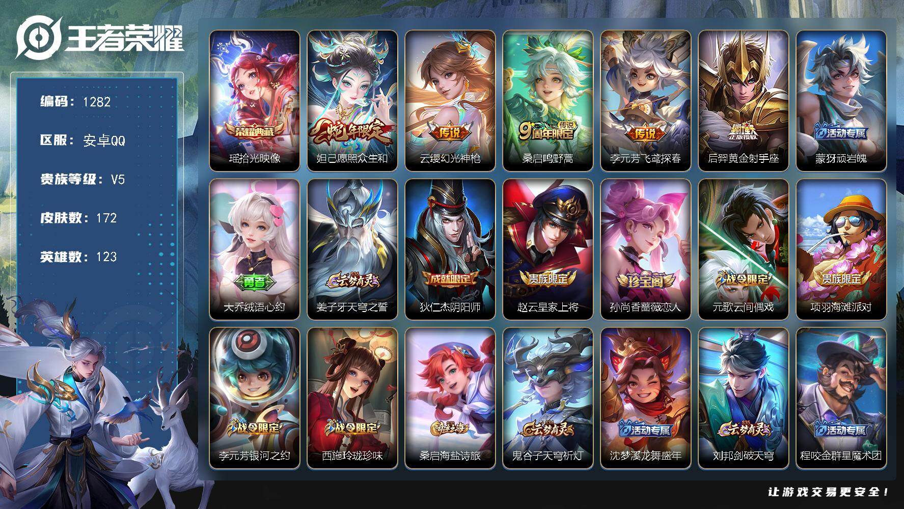 2341415 纯女号 安卓Q-V5-最强王者段位-123英雄-172皮肤