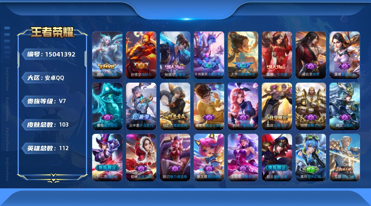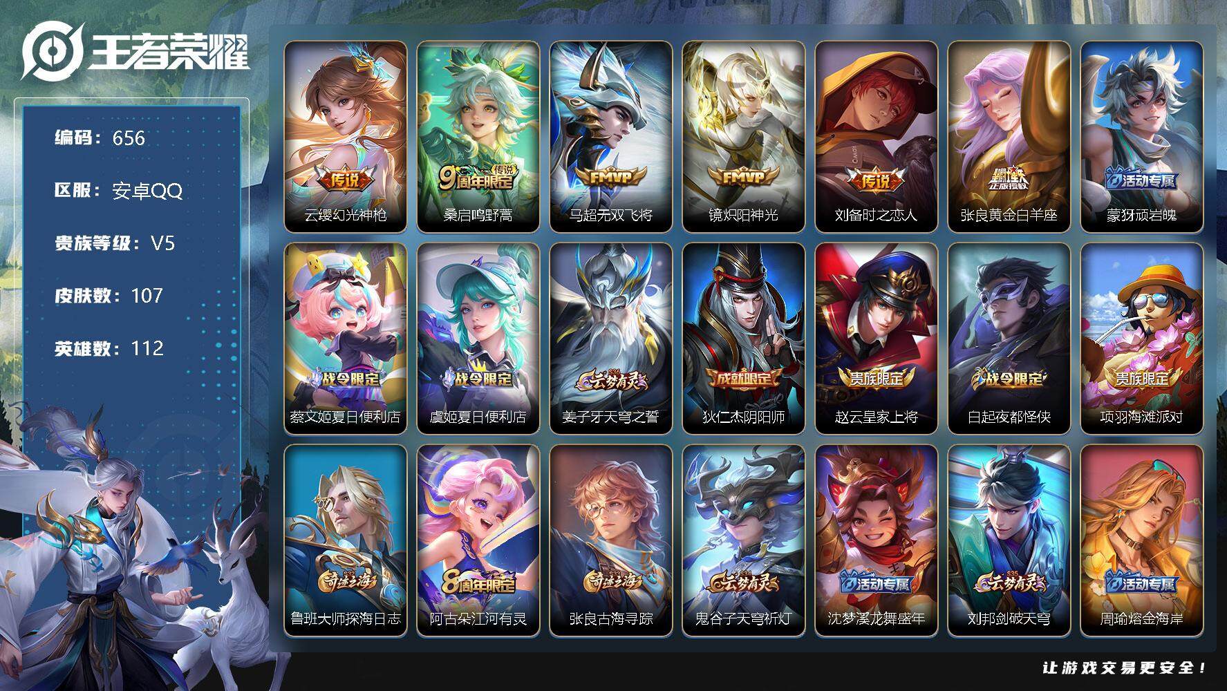 【商品标题】:安卓Q-V5-至尊星耀V段位-112英雄-107皮肤-6传说-2