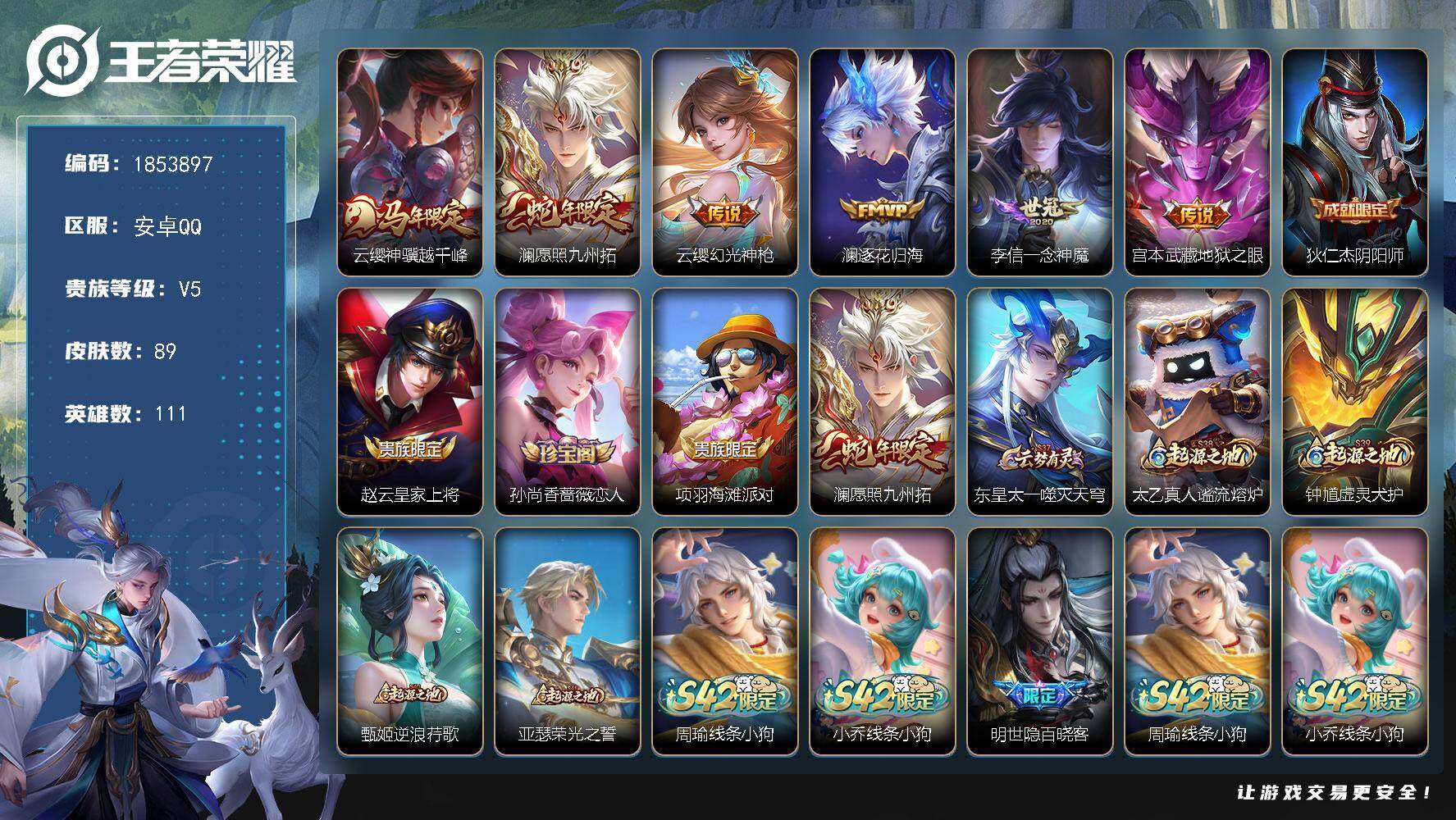 可二次【152皮肤10传说可秒换绑】安卓QQ-128英雄-