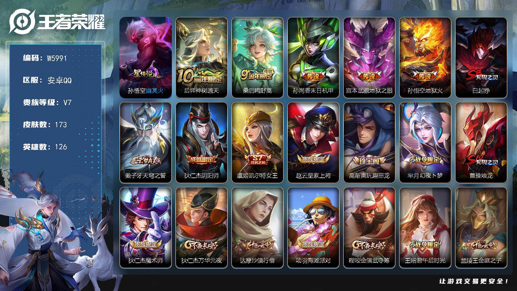 贵族7/皮肤152/典藏1/传说2/史诗28/英雄126/全息碎影 孙悟空/