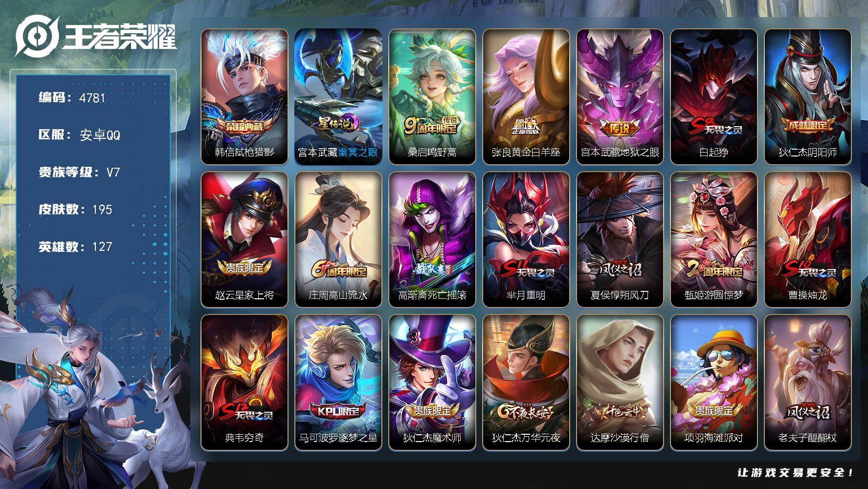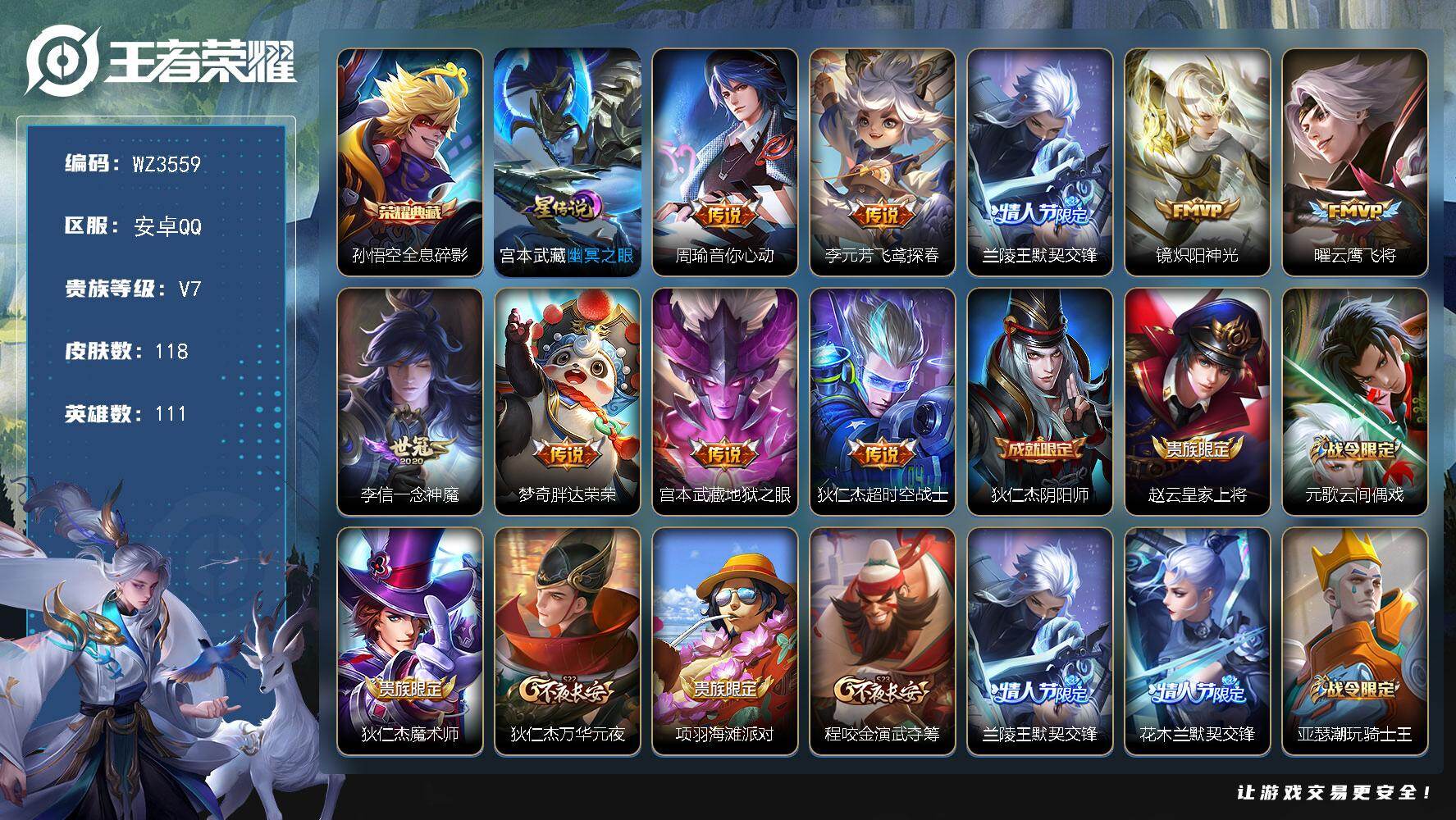 【秒换绑】安卓Q-V7-最强王者段位-111英雄-118皮肤-1典藏皮肤-9传
