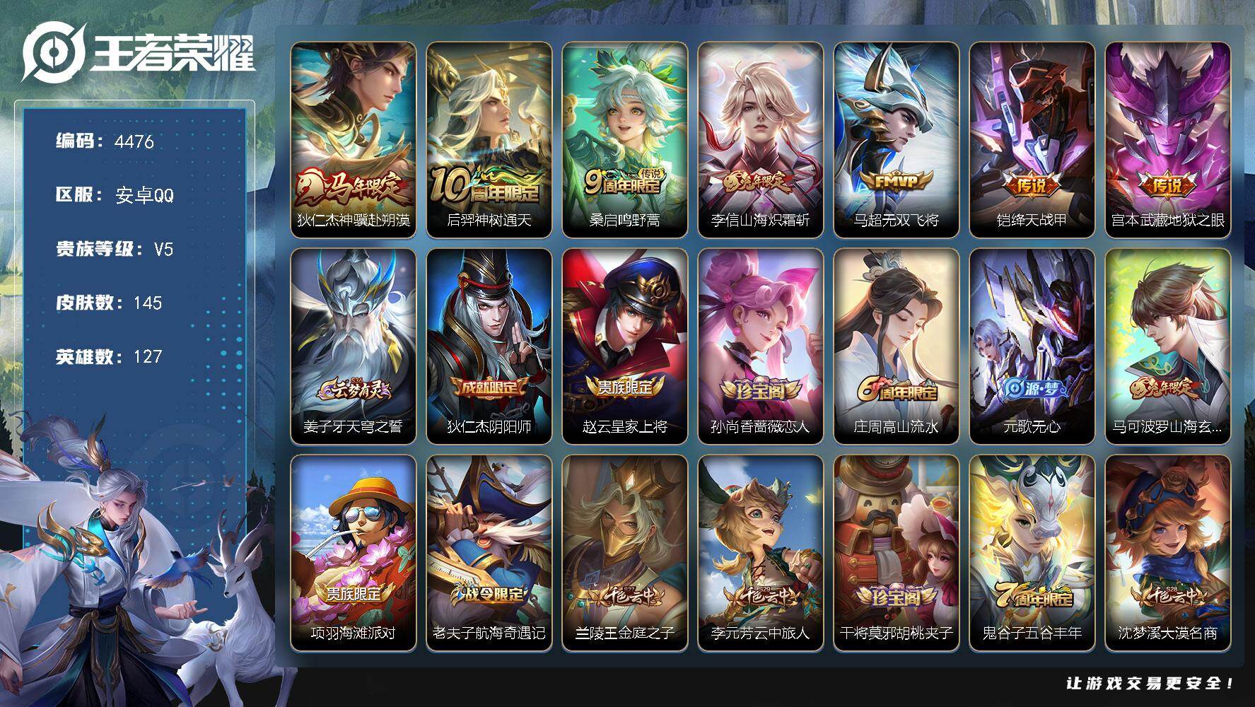 实名: 可修改 贵族等级: V5 英雄数: 95 皮肤数: 75 传说皮: 久