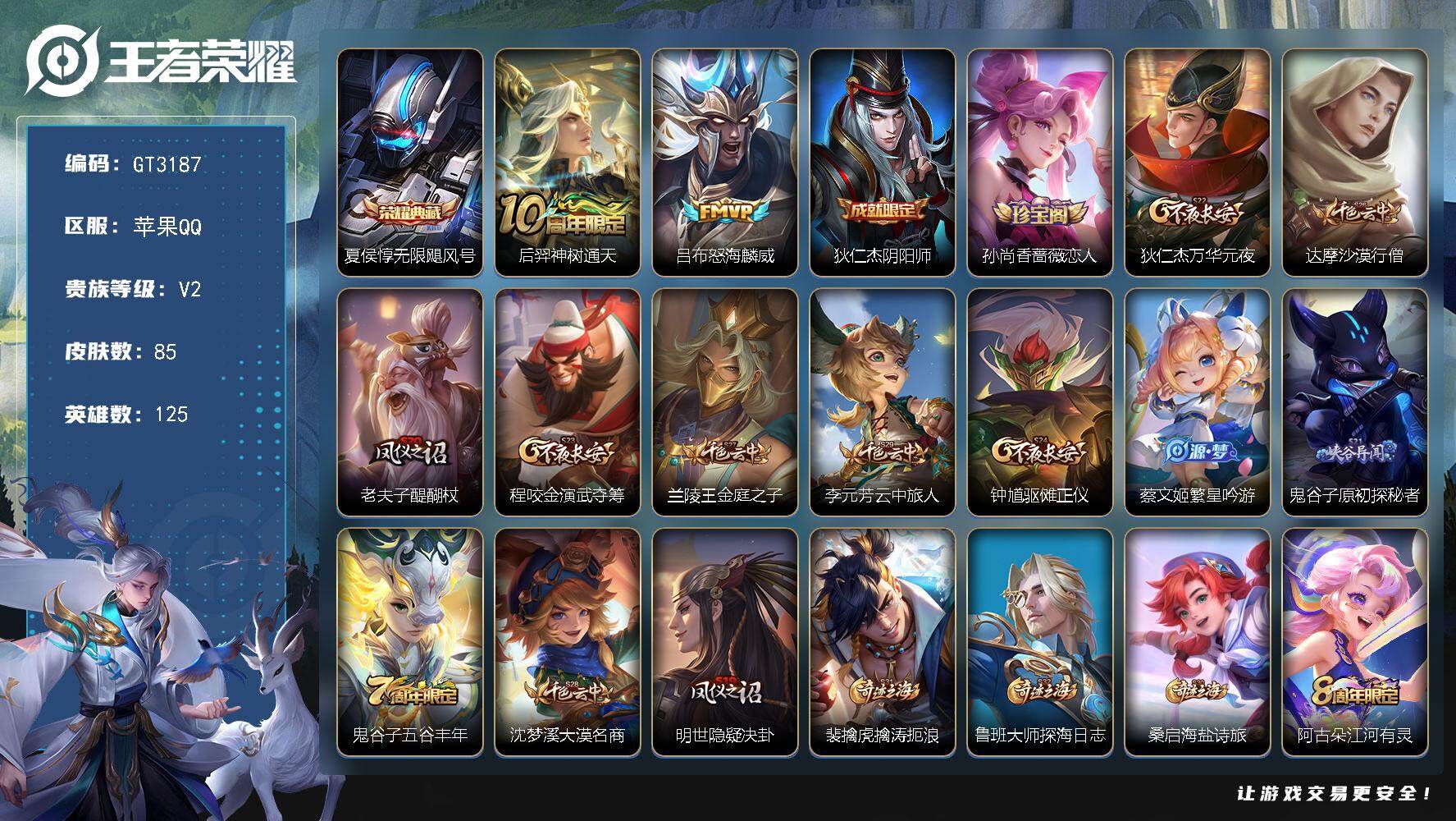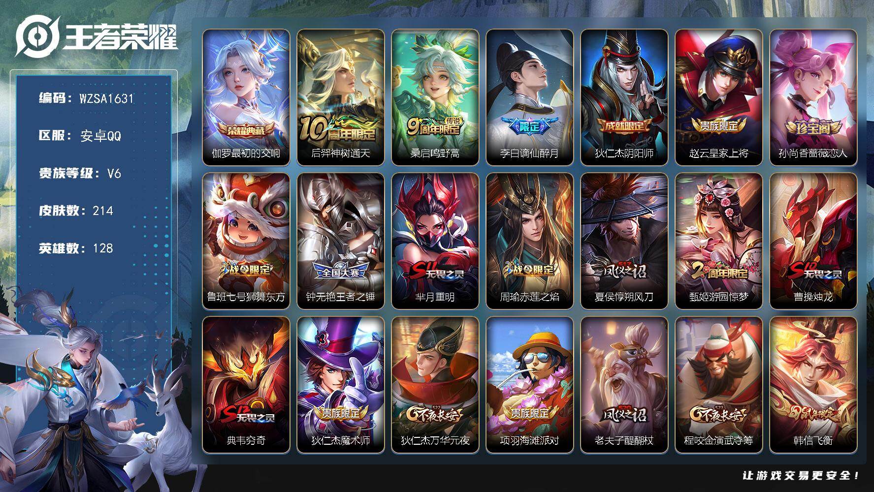 实名: 可修改 贵族等级: V7 英雄数: 108 皮肤数: 132 传说皮: