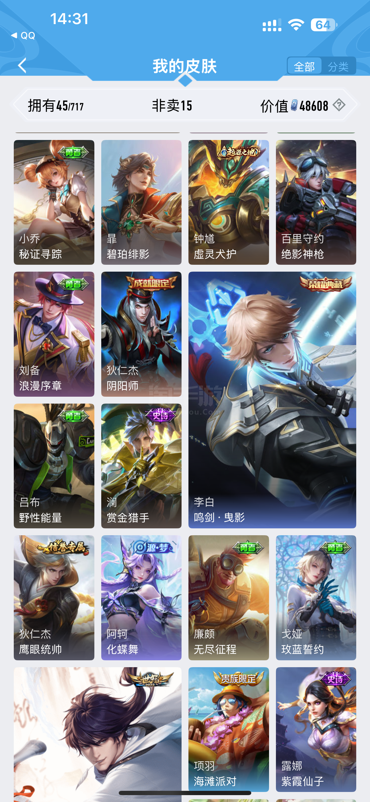 安卓QQ 皮肤38 英雄74 传说1 其他皮肤16 非凡王者-李逍遥小号,满铭文,高胜率