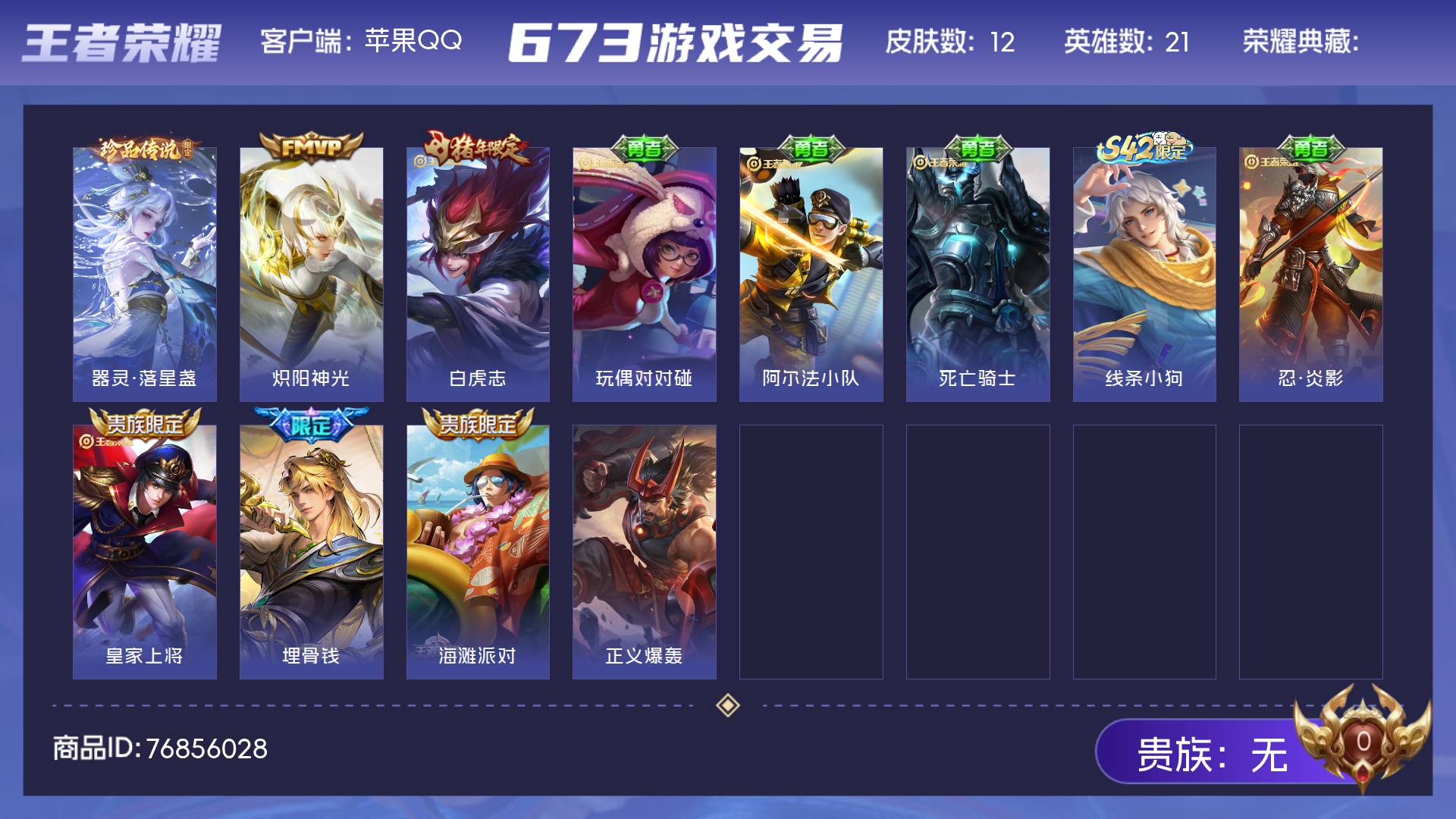 贵族等级: V7 英雄数: 125 皮肤数: 126 荣耀水晶