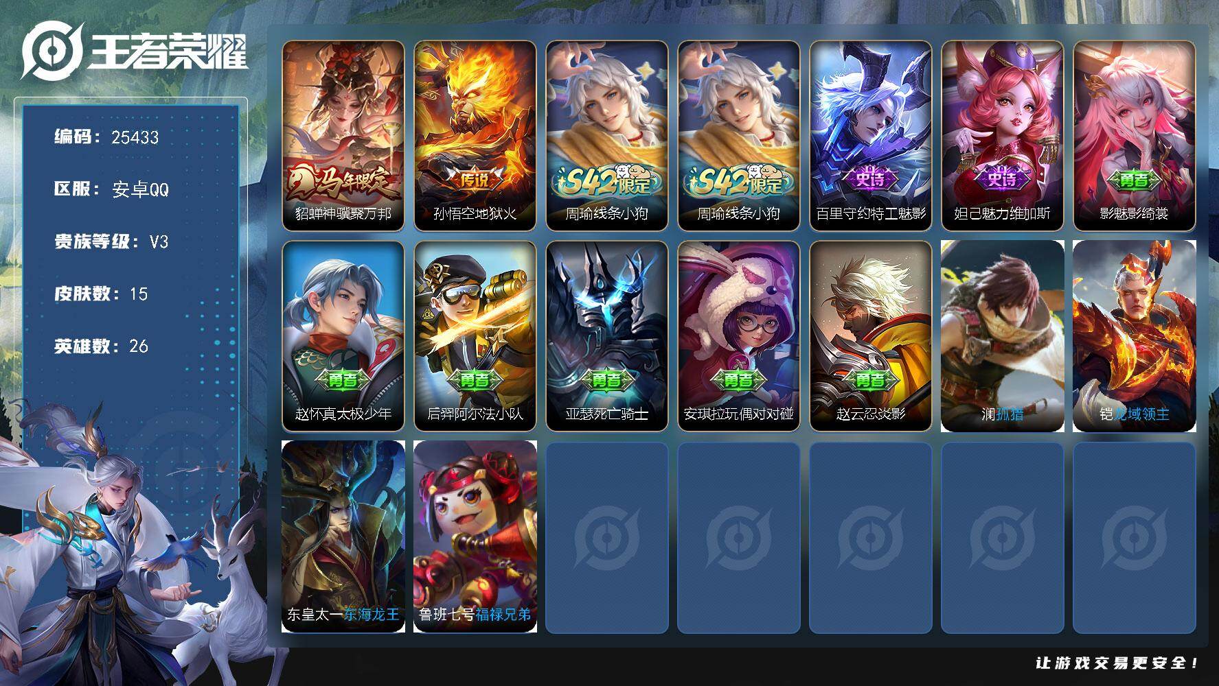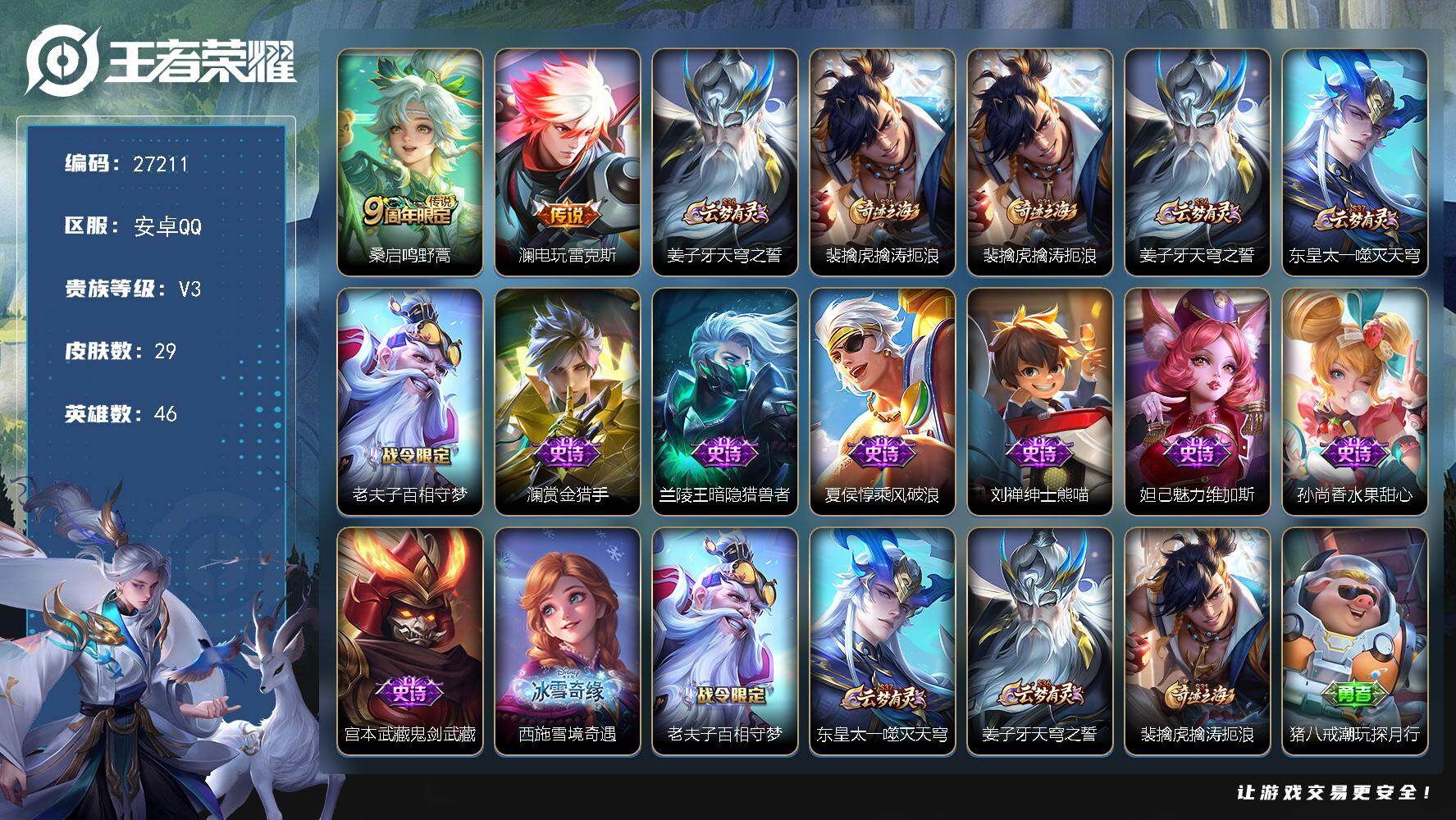 【黄金狮子座 1传说可秒换绑】安卓QQ-30英雄-12皮肤