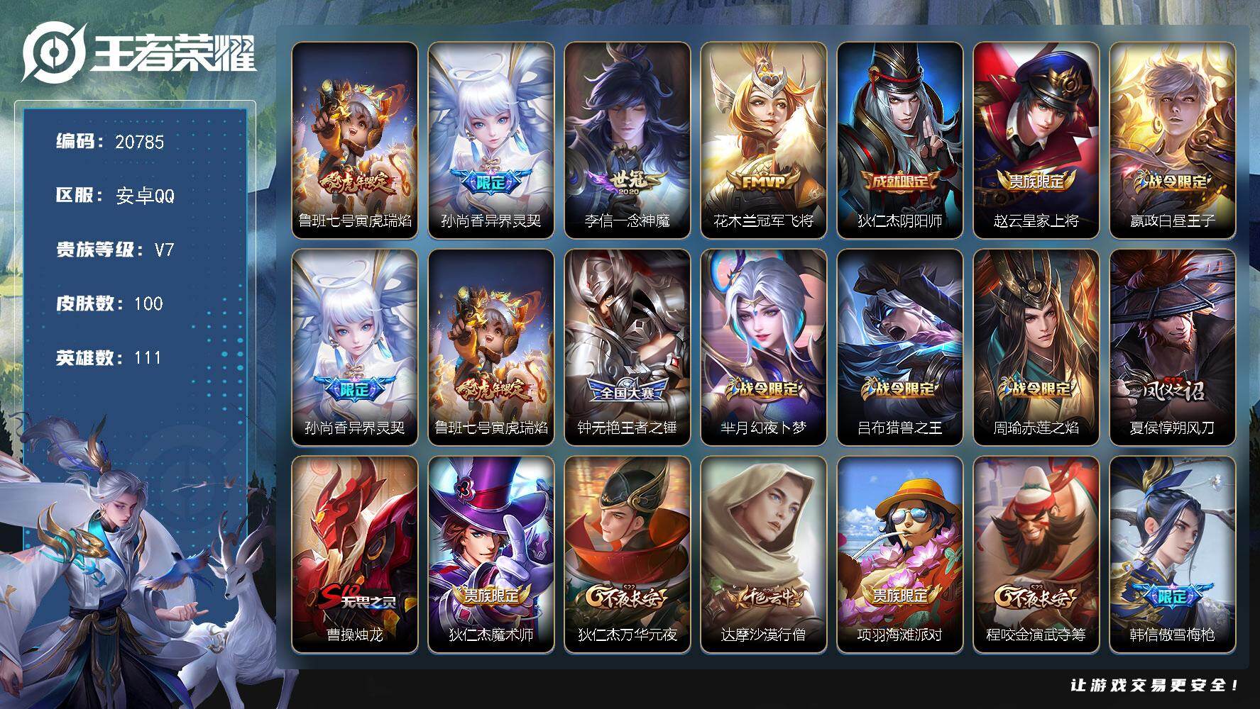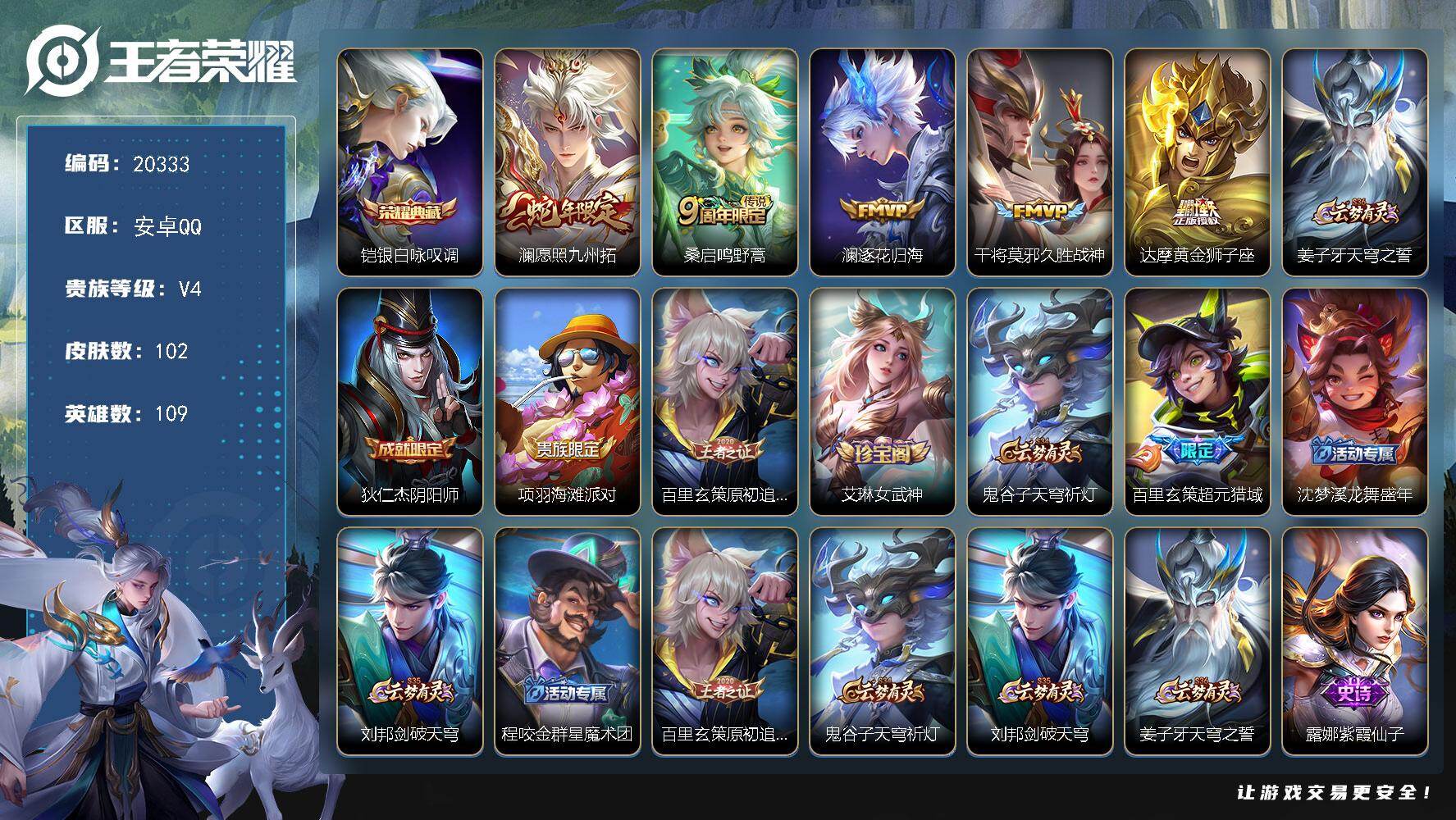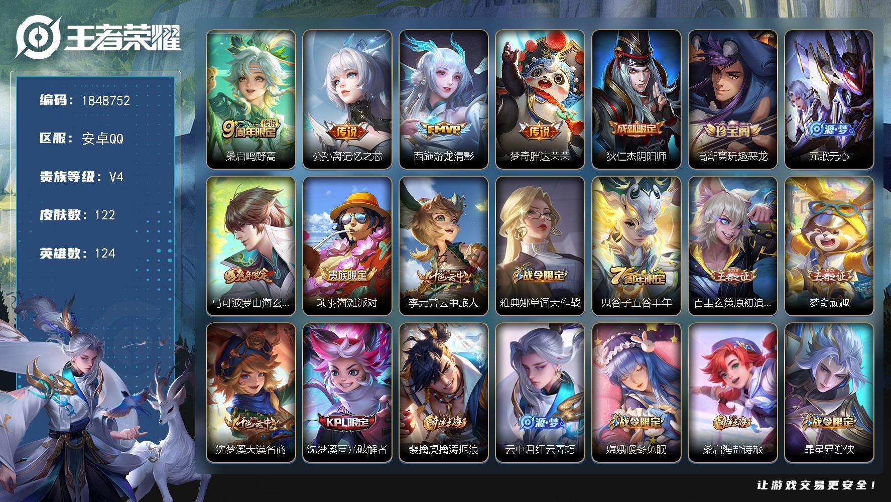安卓QQ-可二次-182皮肤-126英雄-q52级,2传说、秒换绑不用等