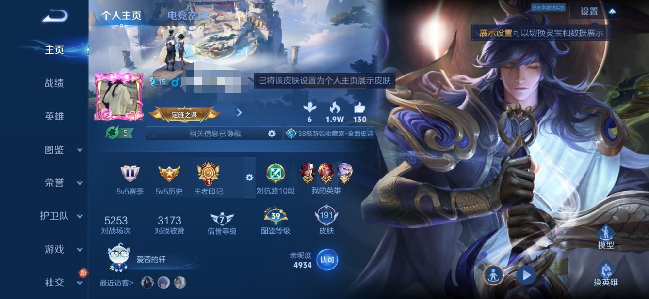 贵族等级: V6 英雄数: 125 皮肤数: 179 传说皮: 冠军飞将,神树