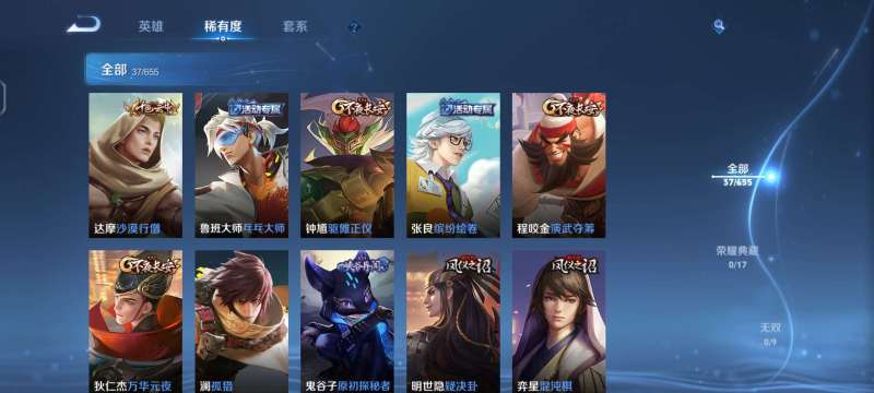 无双王者,史诗10 限定21 英雄123皮肤98 稀有英雄7贵族3级 皮肤价值:35348