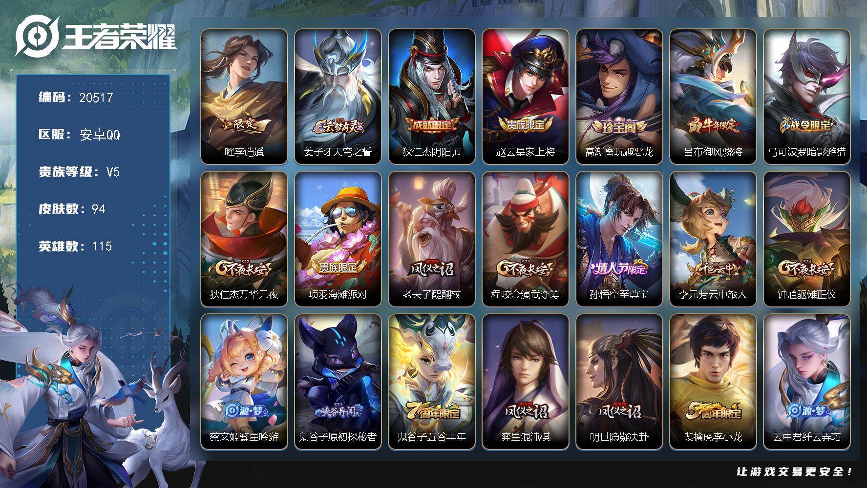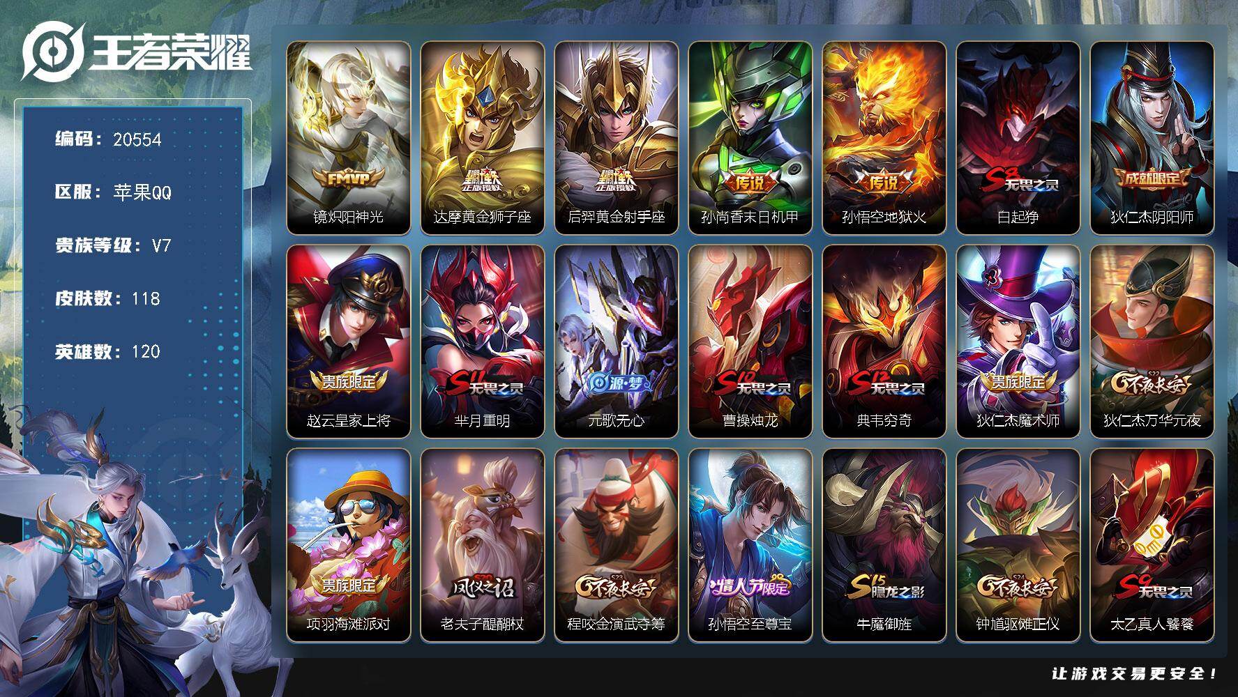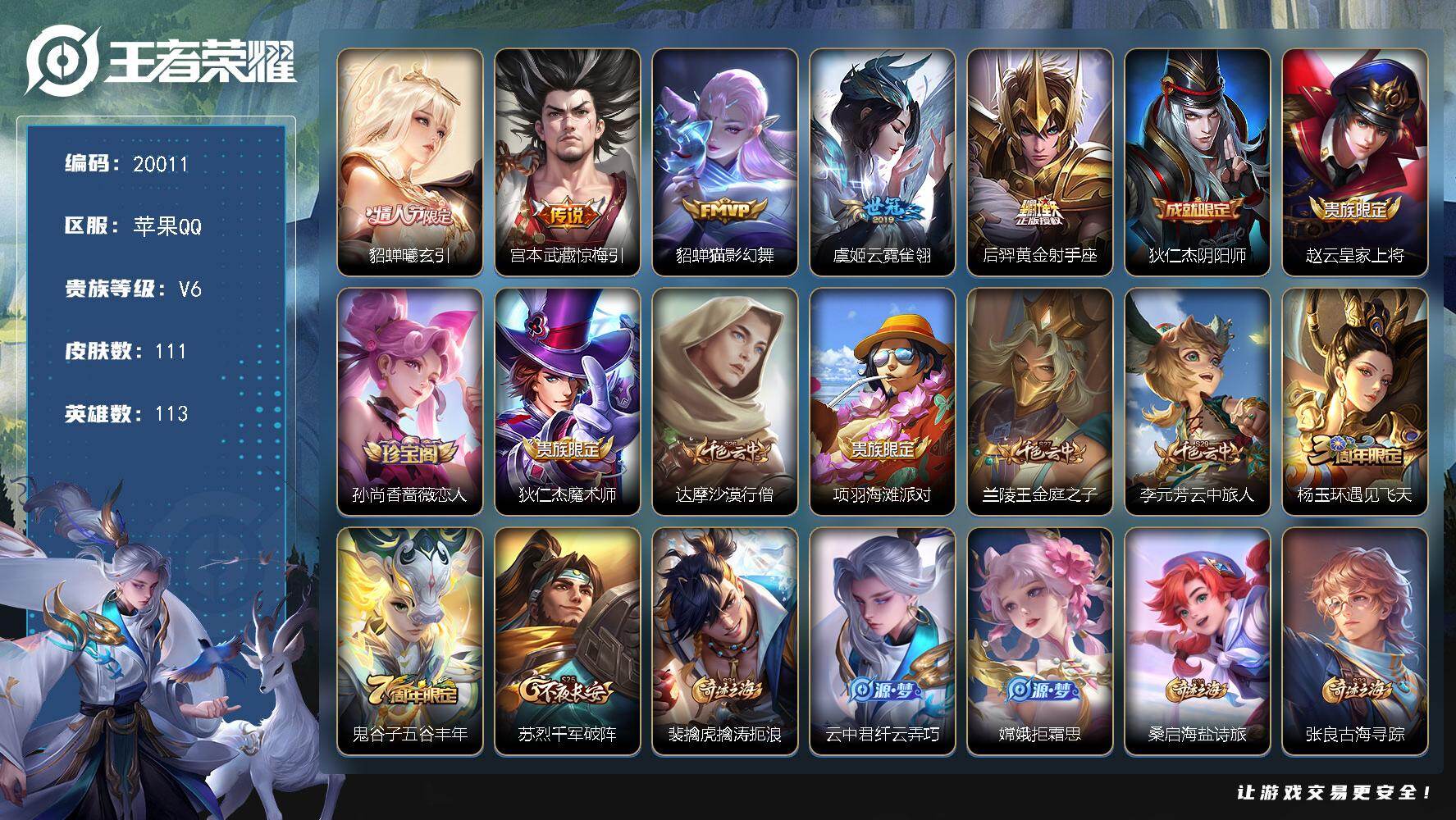 实名: 可修改 贵族等级: V4 英雄数: 114 皮肤数: 69 传说皮: