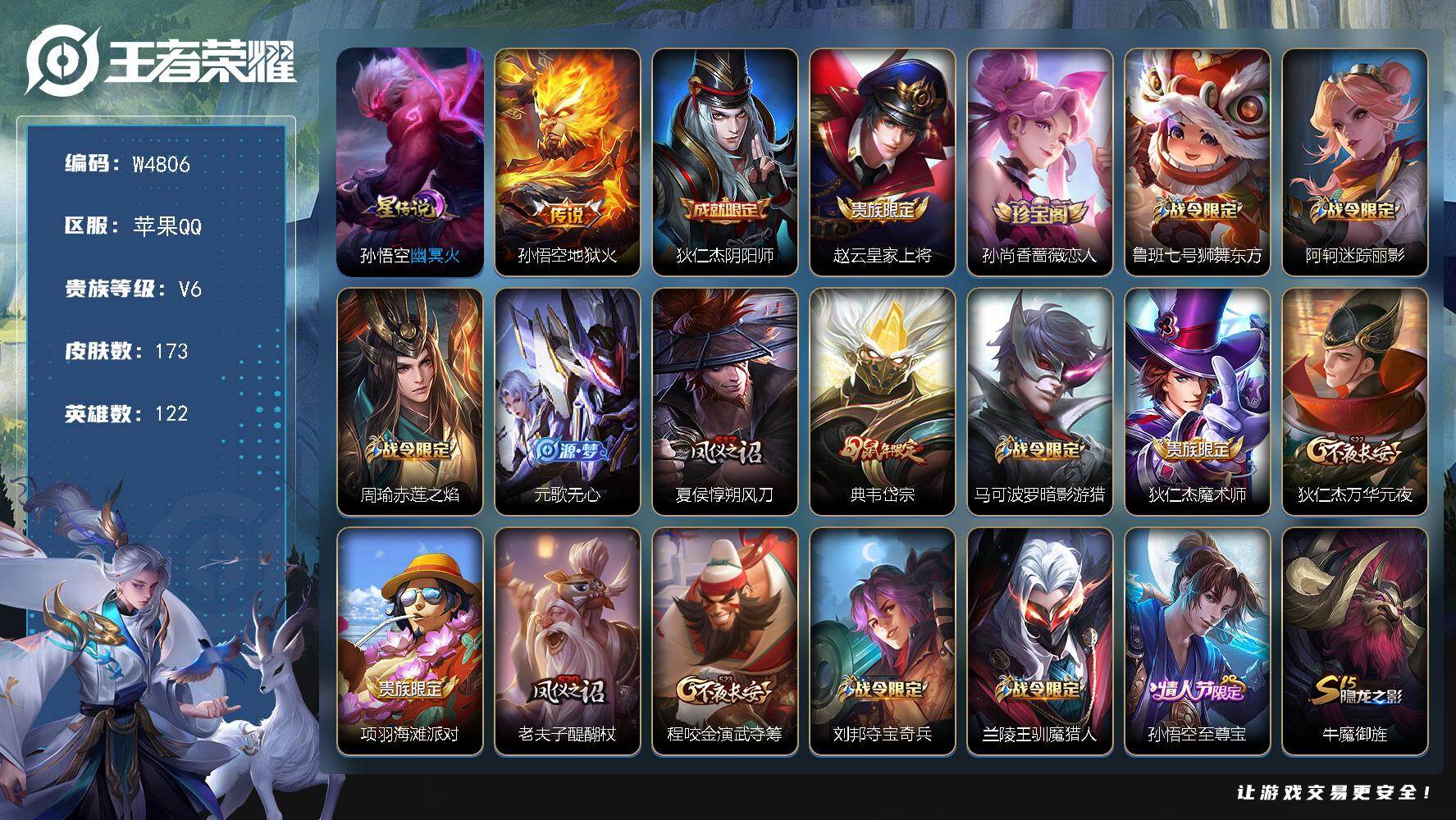 153皮肤1水晶4传说可秒换绑