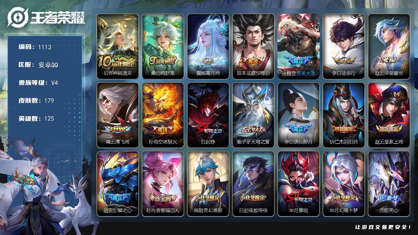 【W4782】安卓Q区-可二次-贵6-117英雄-132皮肤-4传说-39史诗