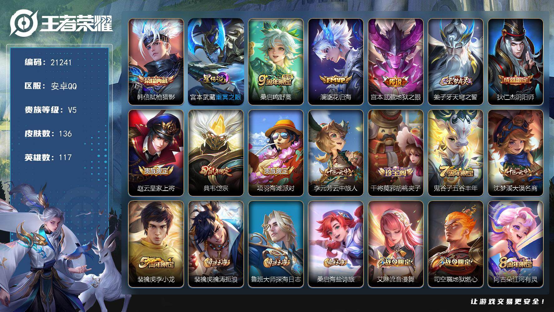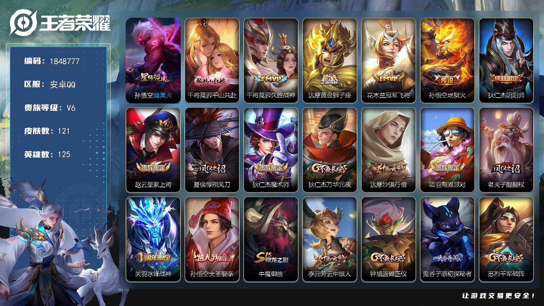 打野21段,5按键 安卓Q-V7-125英雄-194皮肤-3传说-55史诗 【