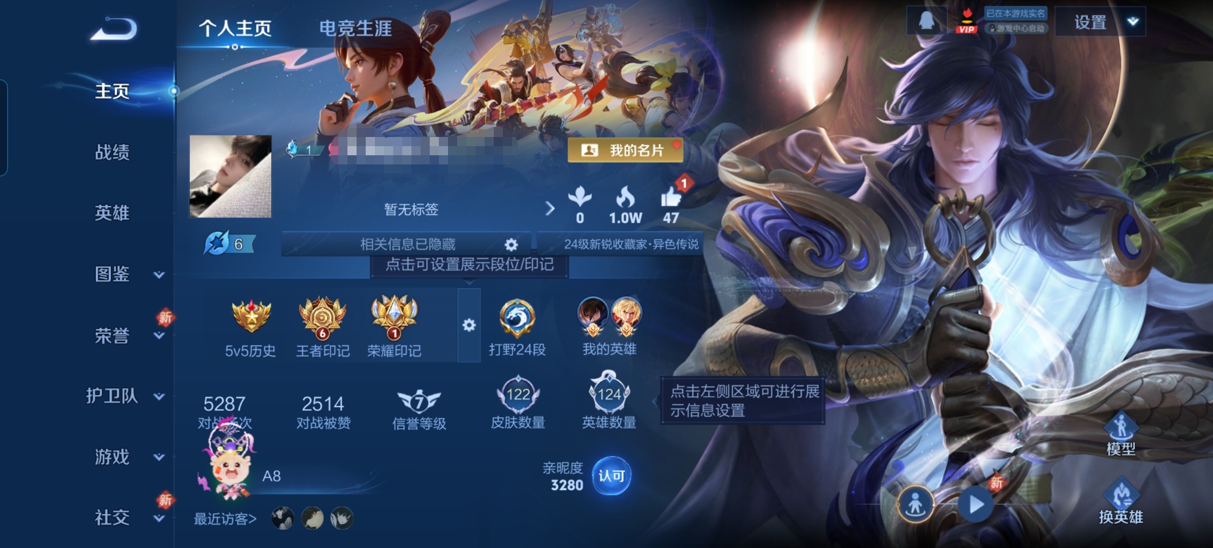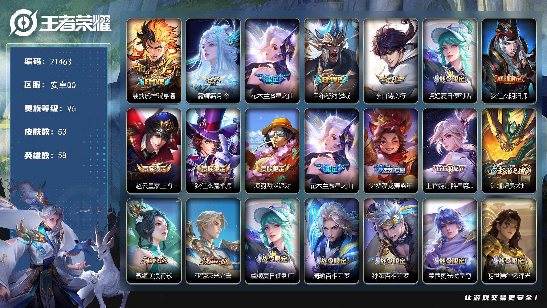 贵族等级: V5 英雄数: 80 皮肤数: 78 荣耀水晶: 星域神启 星传说