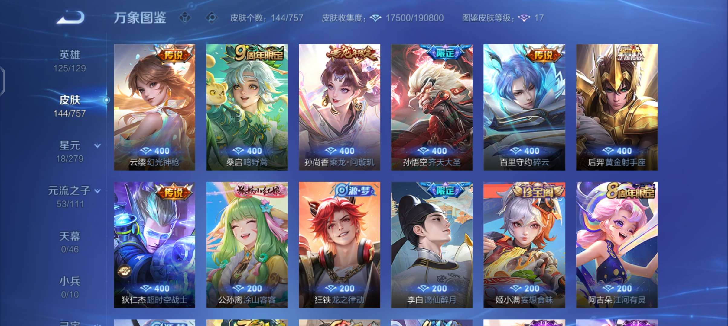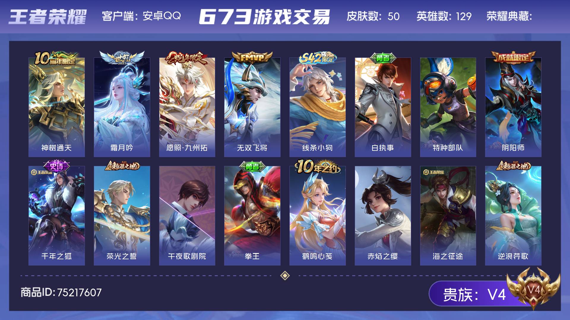 V4 皮肤50 英雄129 至尊星耀 传说4 其他皮肤47