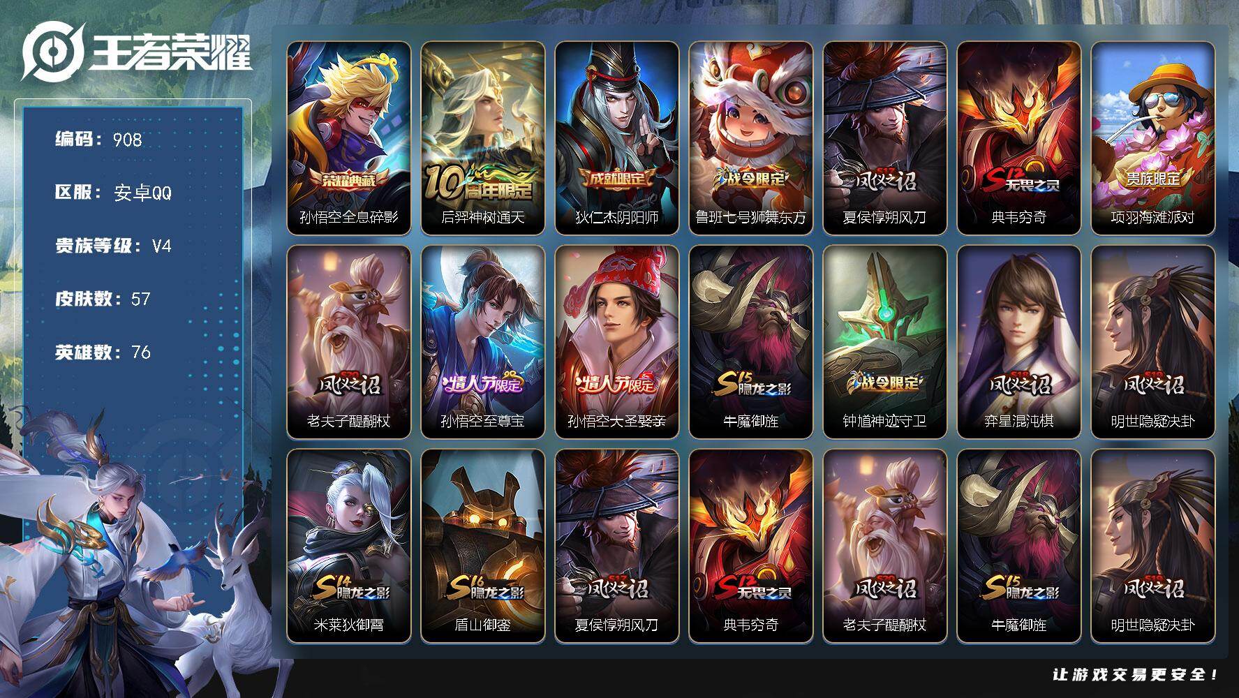 2028867 安卓Q-V4-尊贵铂金III段位-76英雄-57皮肤-1典藏皮