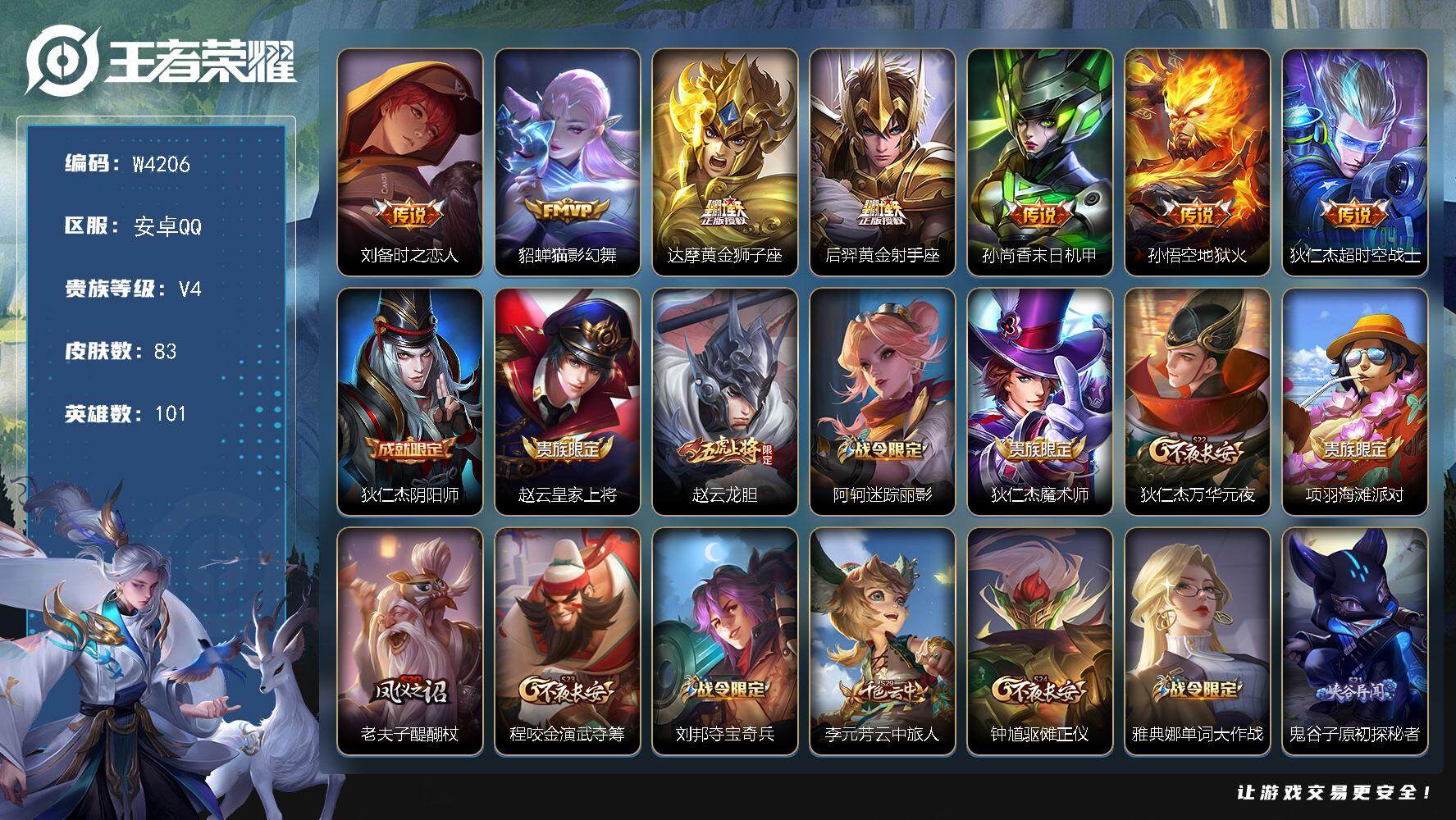 【W4206】安卓Q区-可二次-贵7-101英雄-83皮肤-7传说-16史诗-