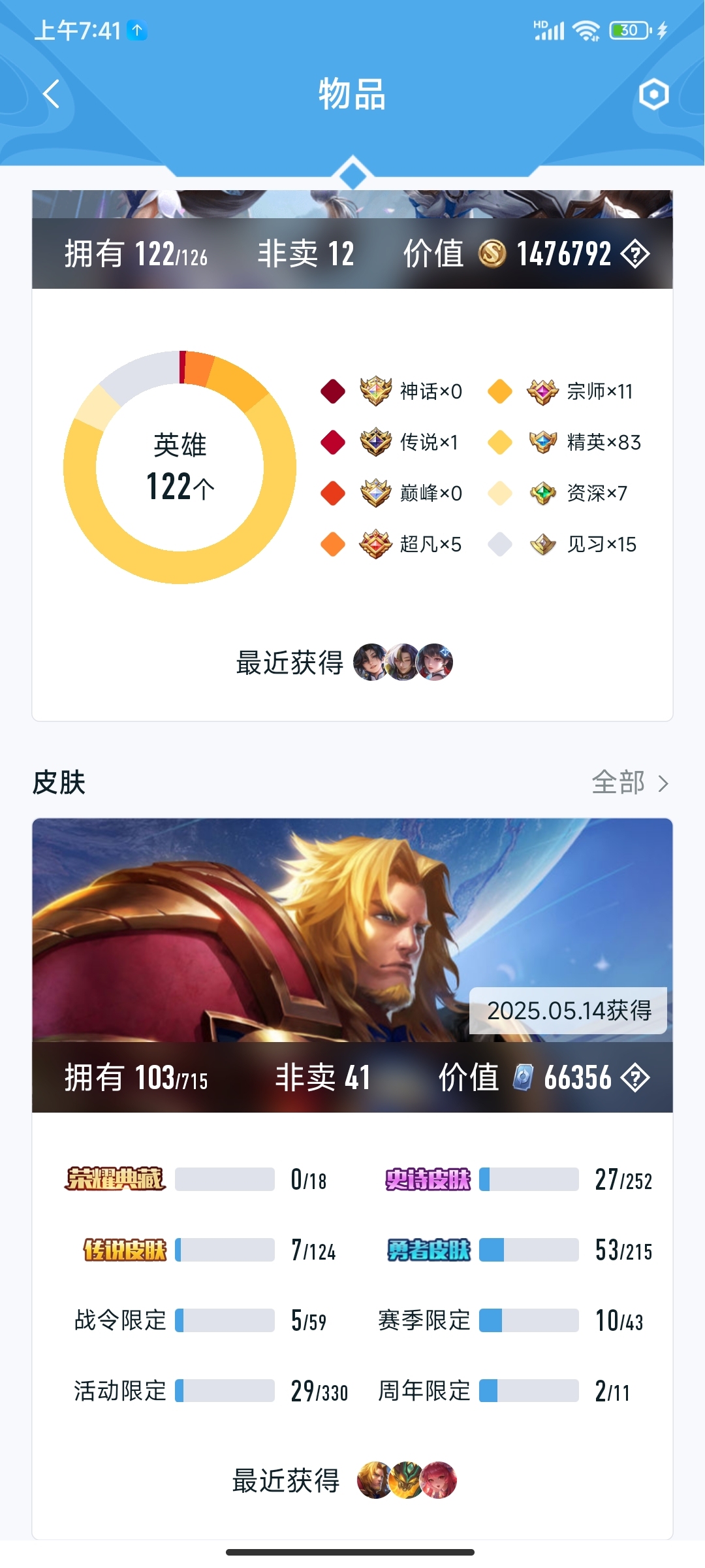 V5 皮肤53 英雄129 至尊星耀 传说8 其他皮肤48