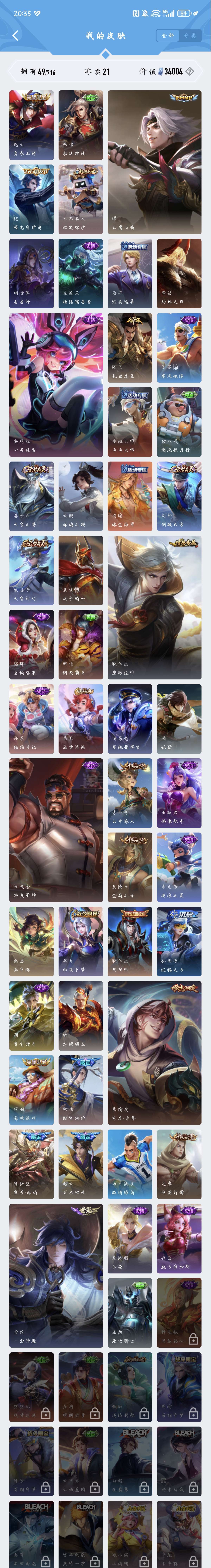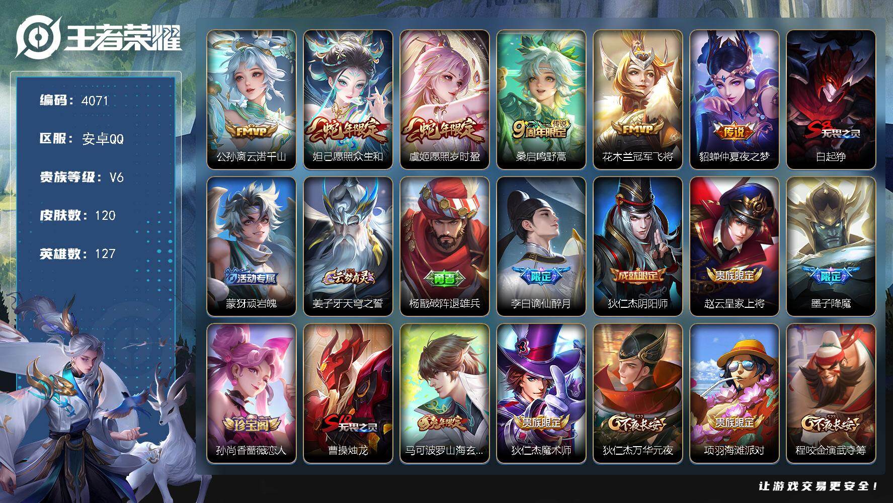 安卓Q-V6-永恒钻石III段位-127英雄-120皮肤-6传说-32史诗【