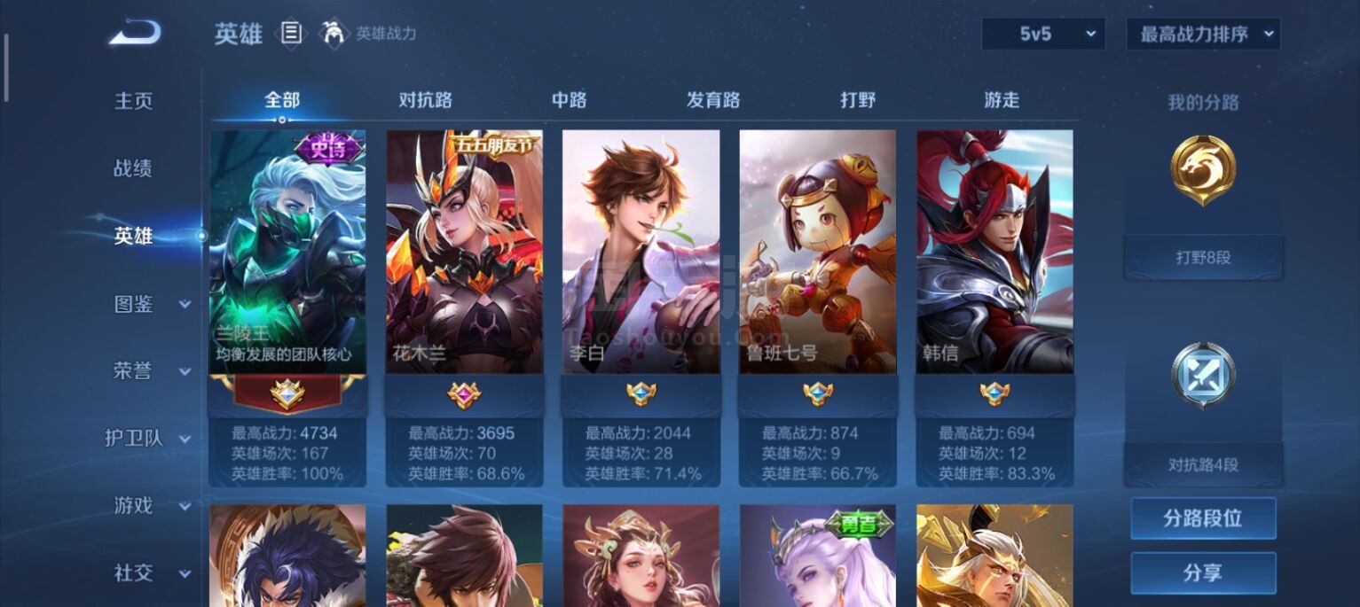 百胜兰陵王排位可发,还有另一个区80胜率韩信,高胜率高评分,现赛季王者可冲巅峰