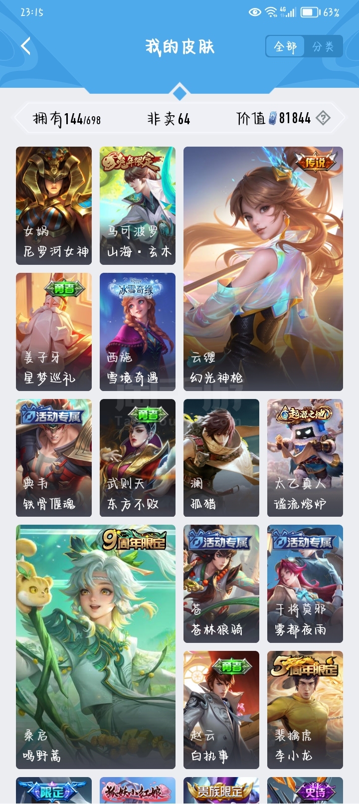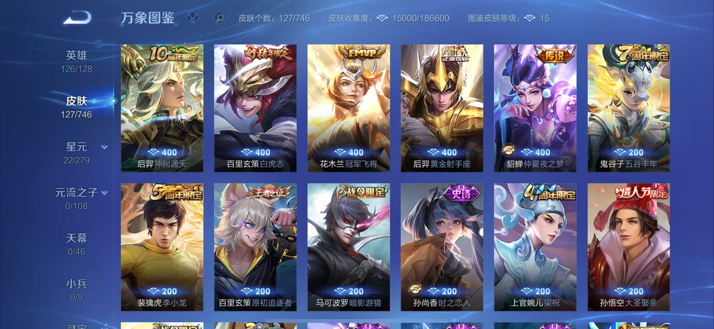 V5 皮肤53 英雄129 至尊星耀 传说8 其他皮肤48