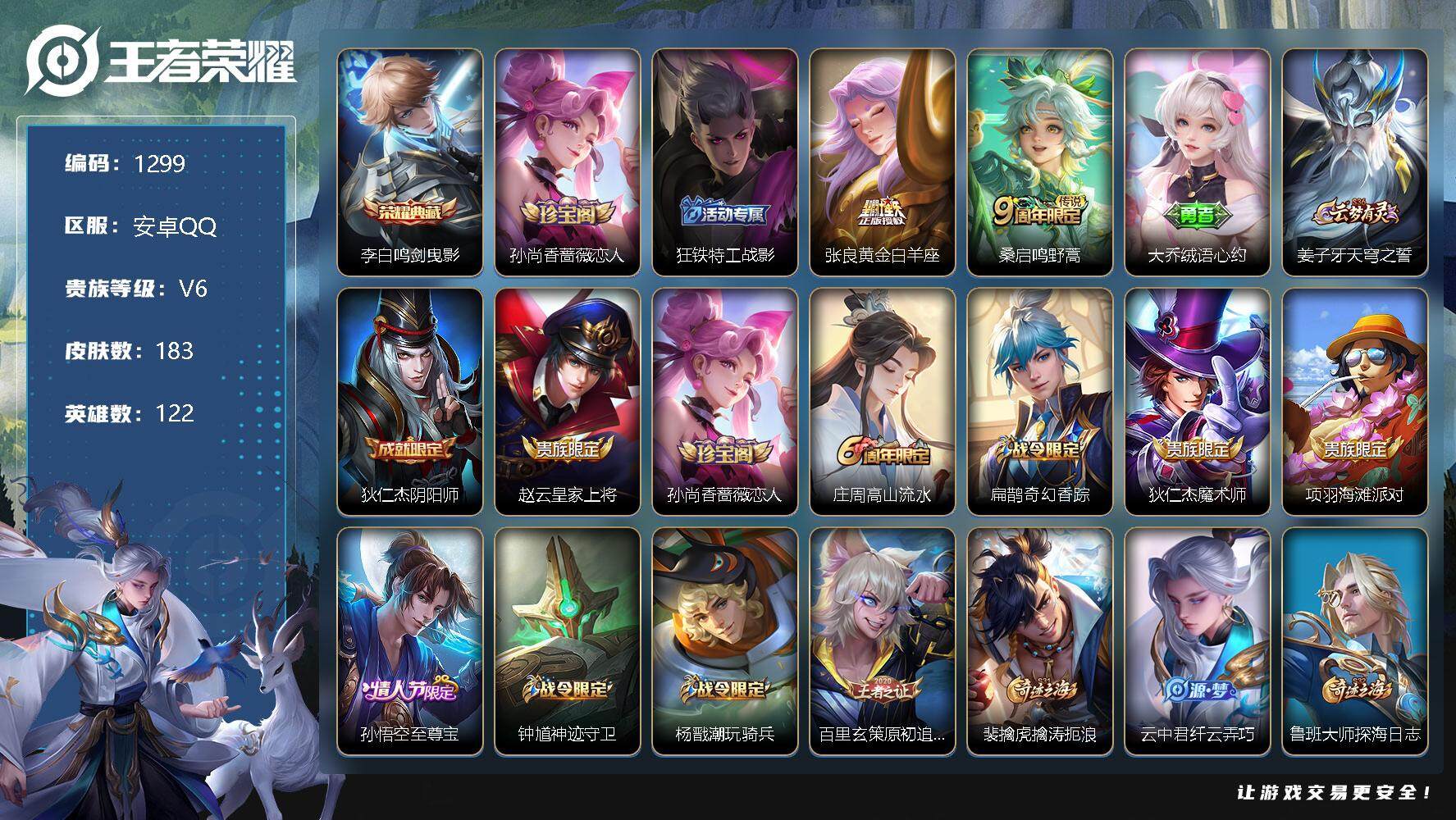 【商品标题】:安卓Q-V6-最强王者段位-122英雄-183皮肤-1典藏-0珍