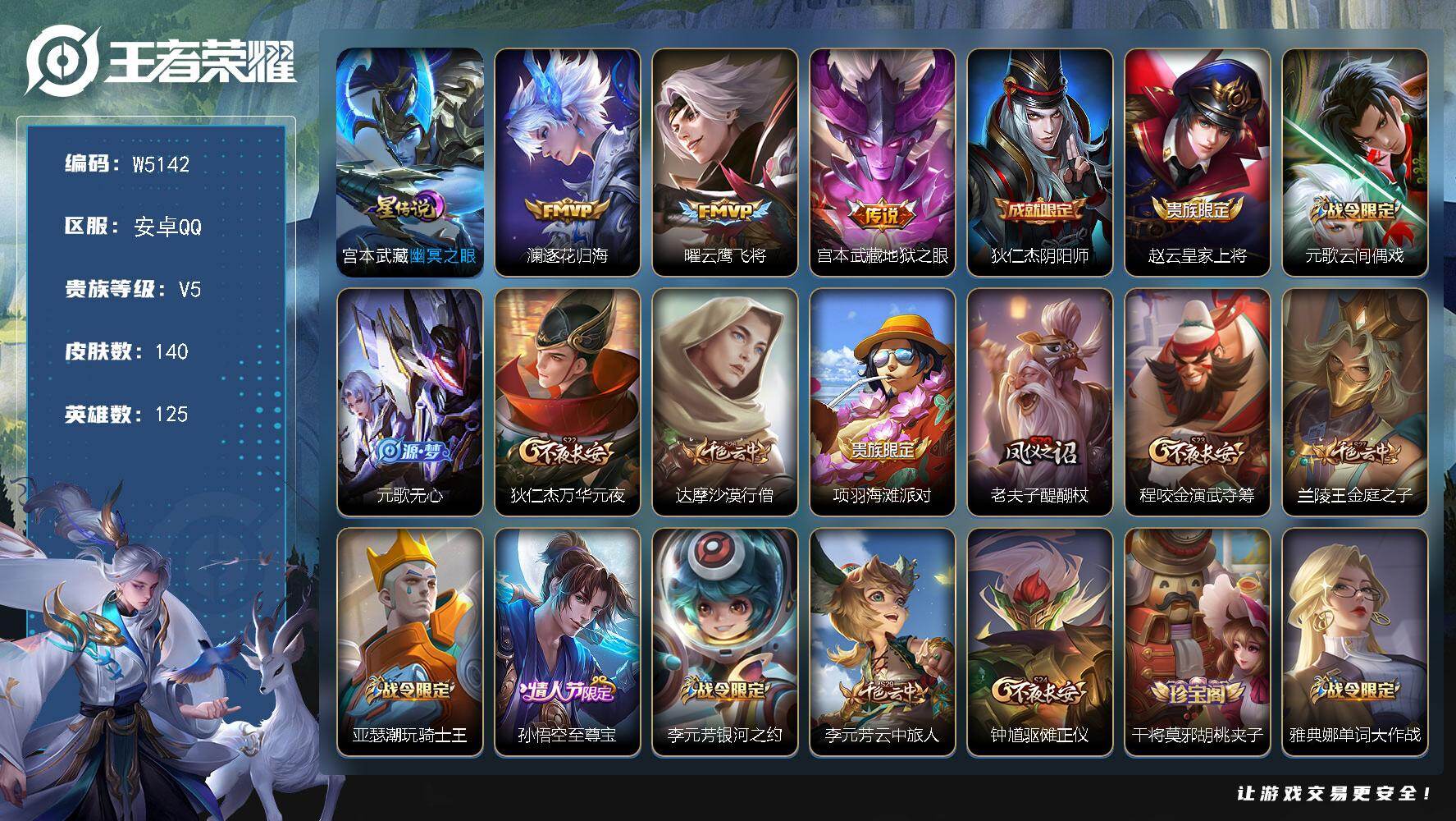 【W5142】安卓Q区-无二次-贵5-125英雄-140皮肤-3传说-1星元-