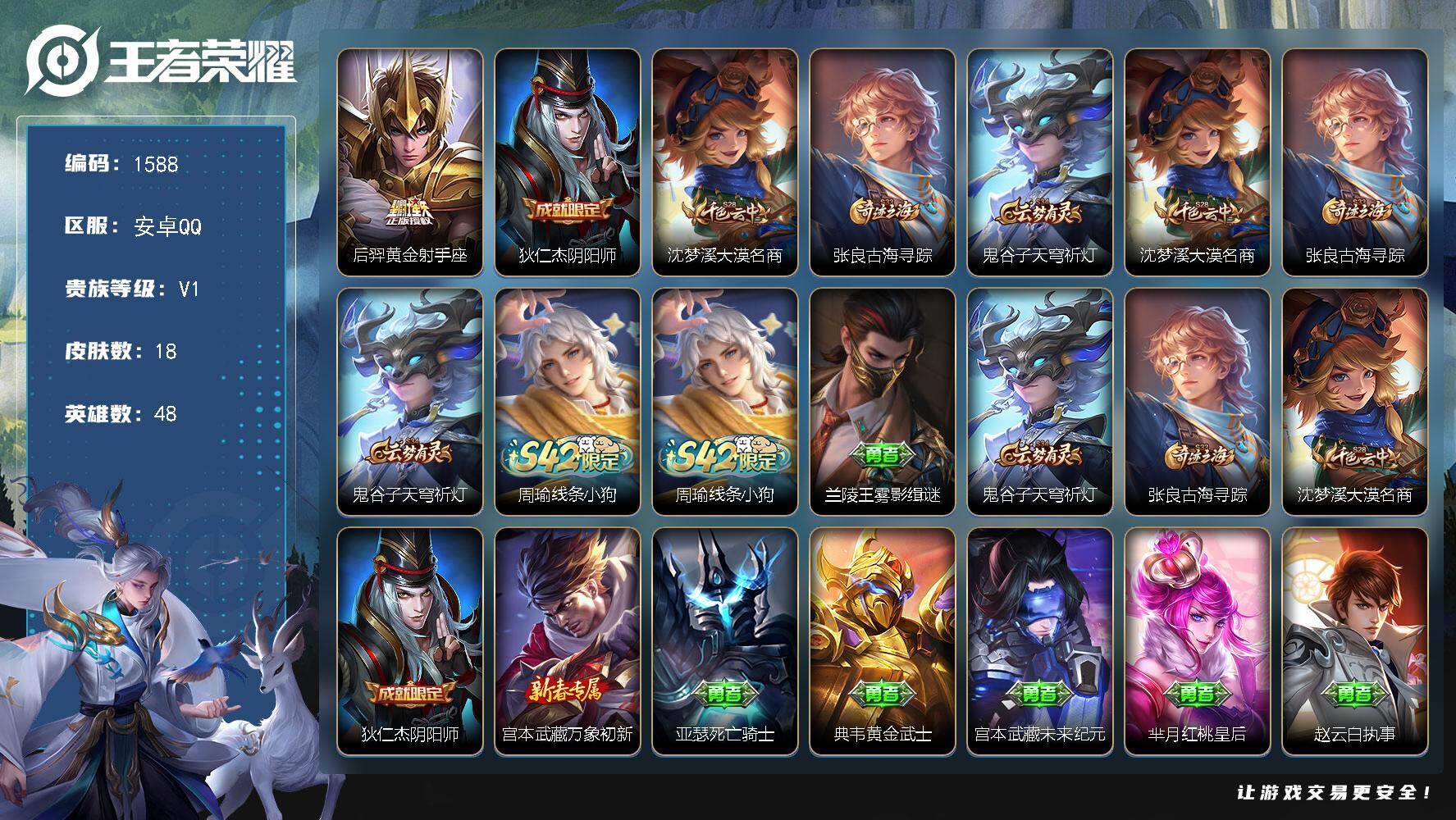 2606746 王者荣耀账号 安卓Q-V1-永恒钻石II段位-48英雄-18皮
