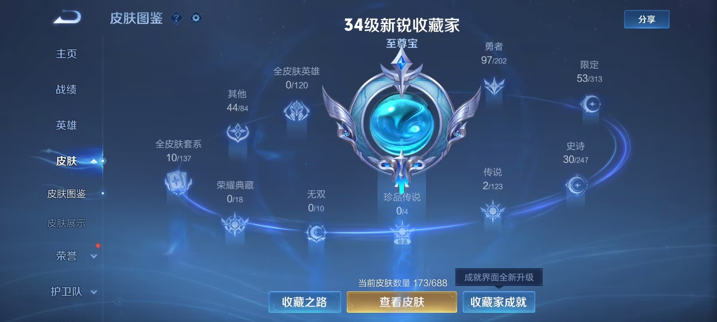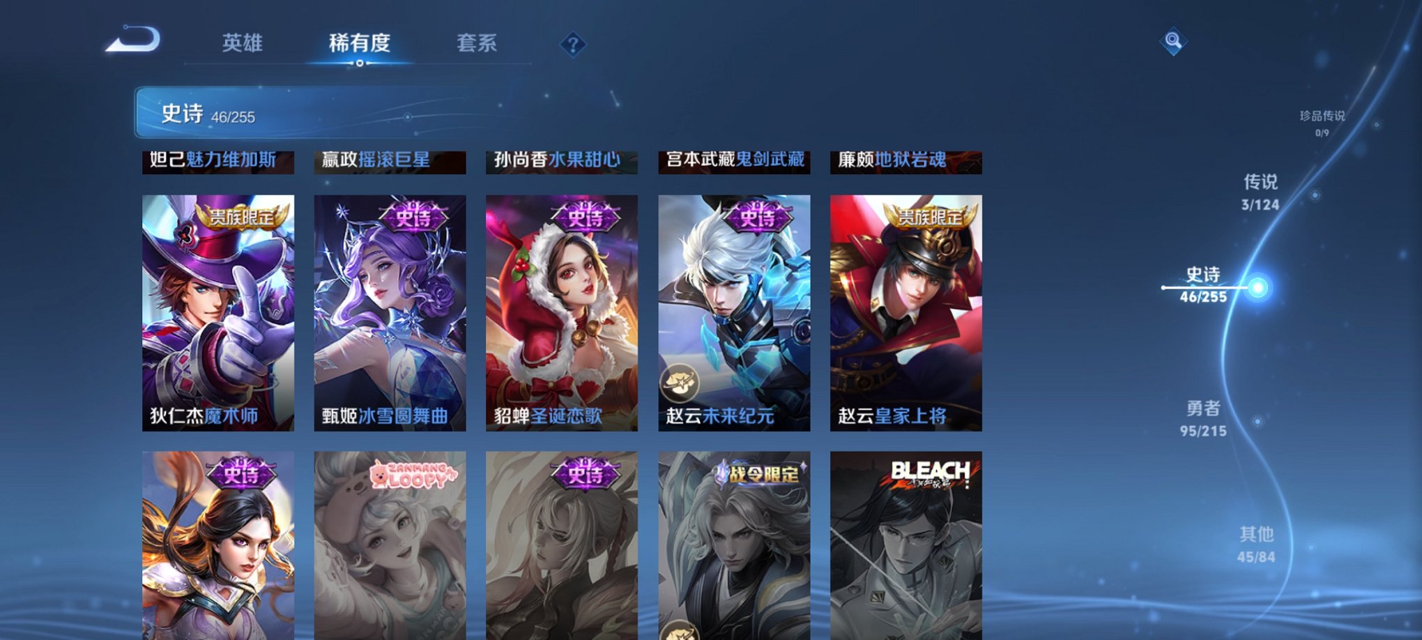 传说6 史诗37 限定47 英雄126 皮肤151 稀