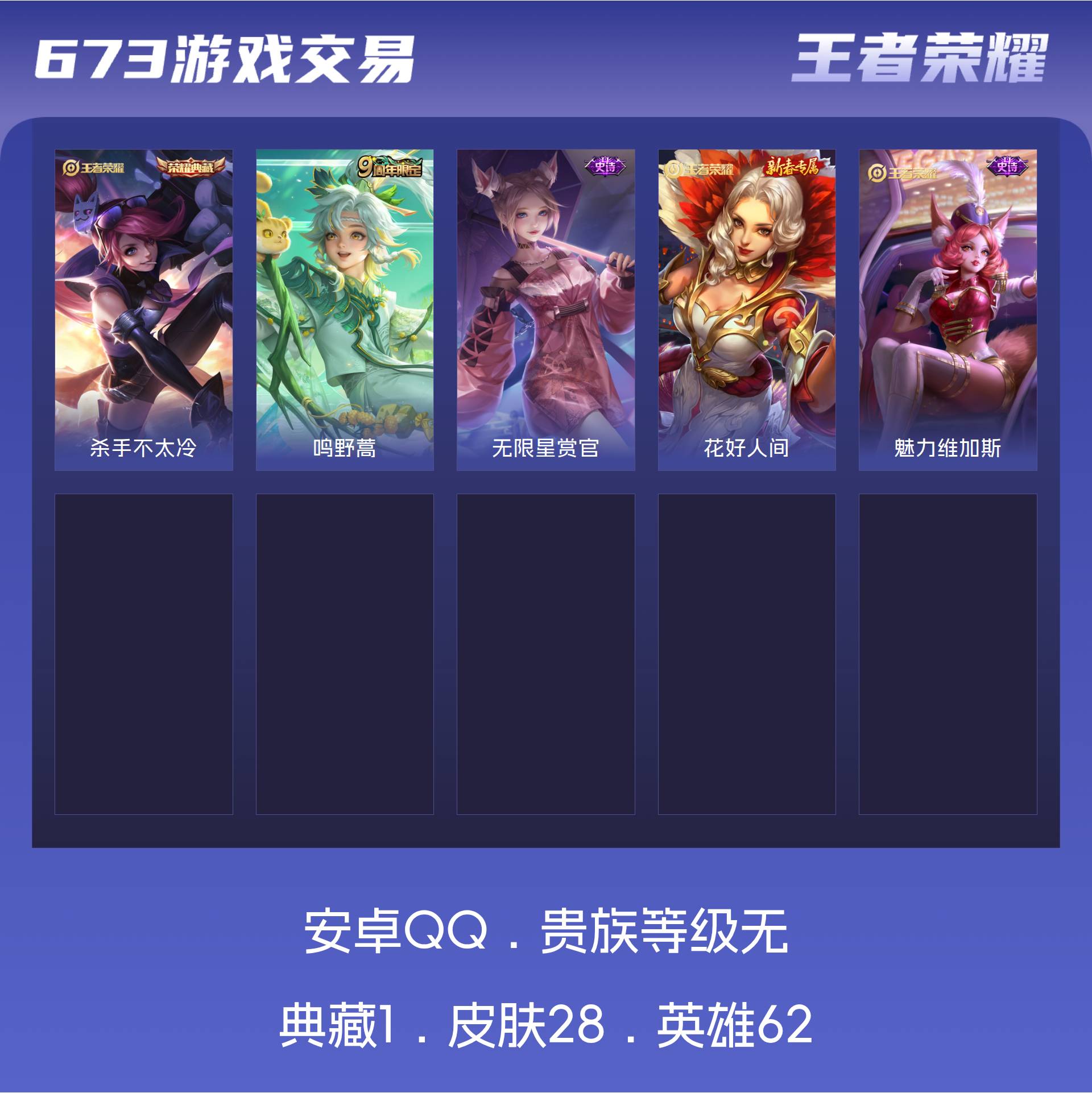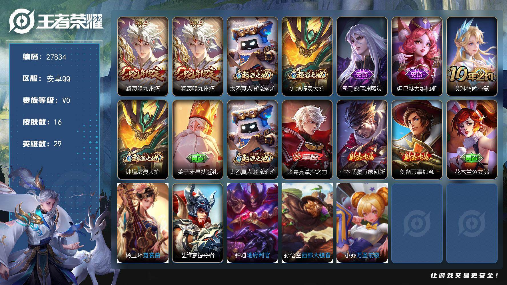 可二次【27皮肤3传说可秒换绑】安卓QQ-59英雄-27皮