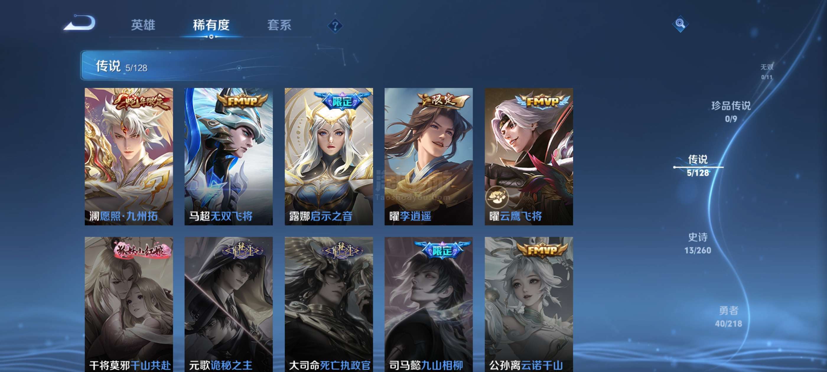 贵族等级: V6 英雄数: 127 皮肤数: 174 荣耀水晶: 最初的交响