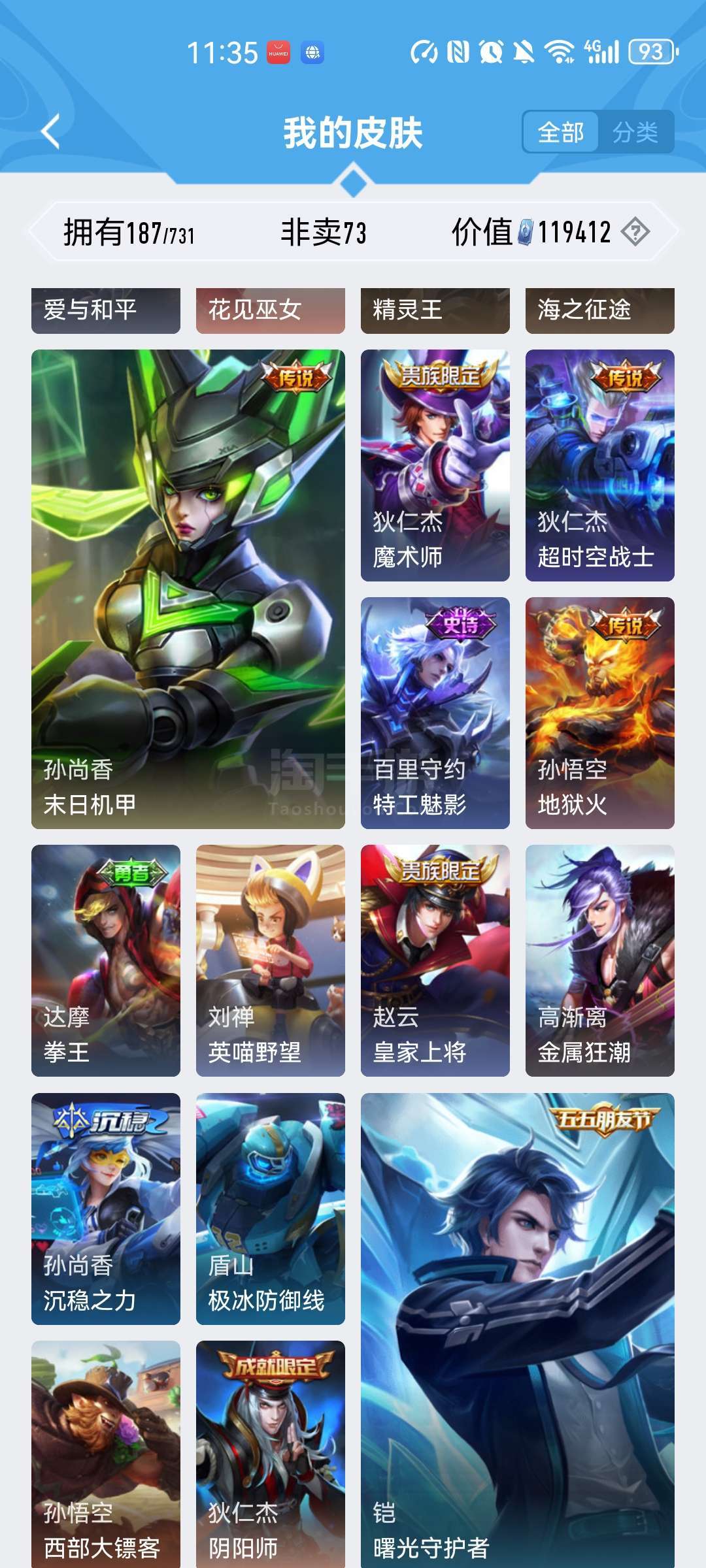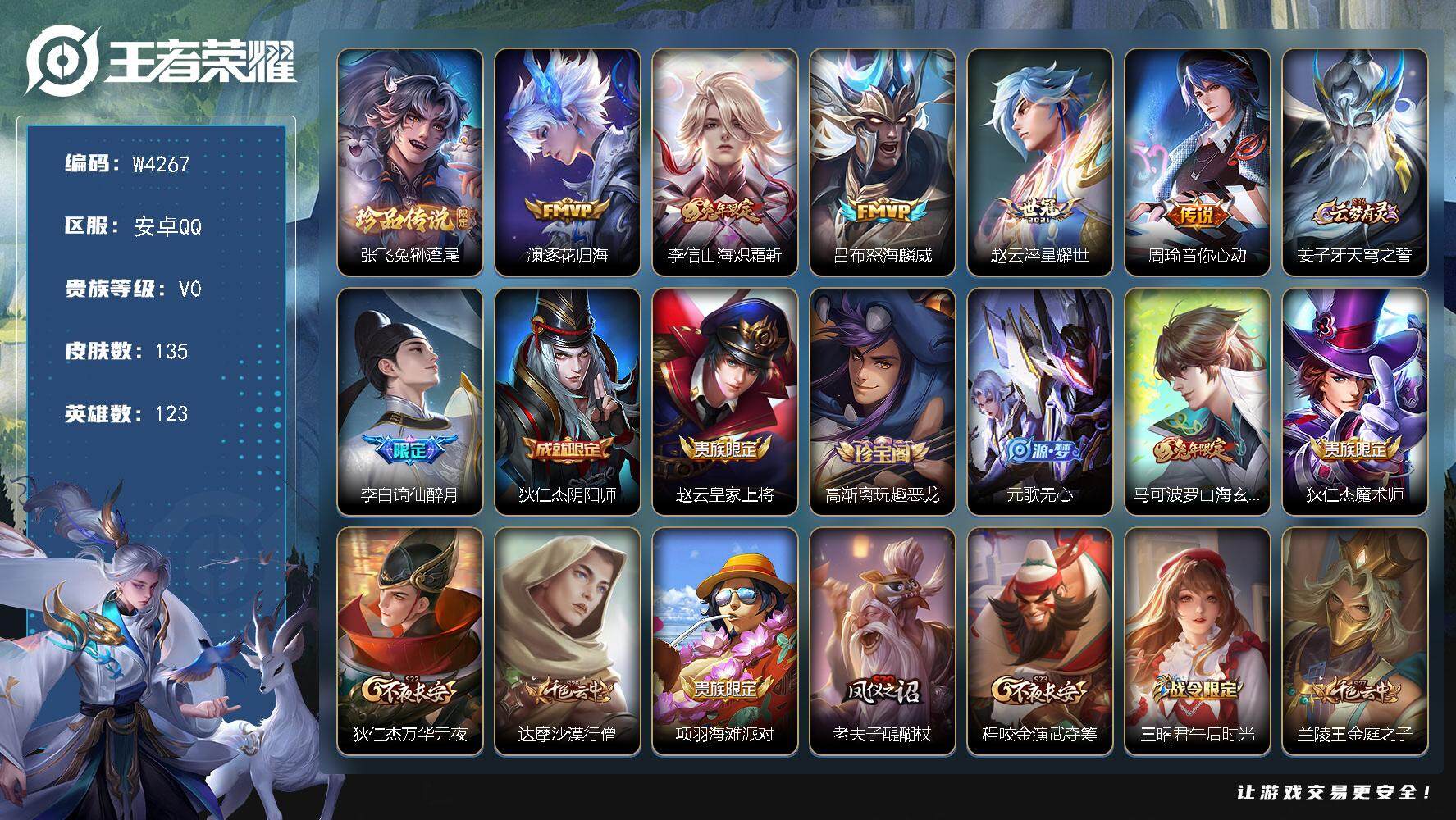 【W4267】安卓Q区-可二次-贵6-123英雄-134皮肤-1珍品传说-5传