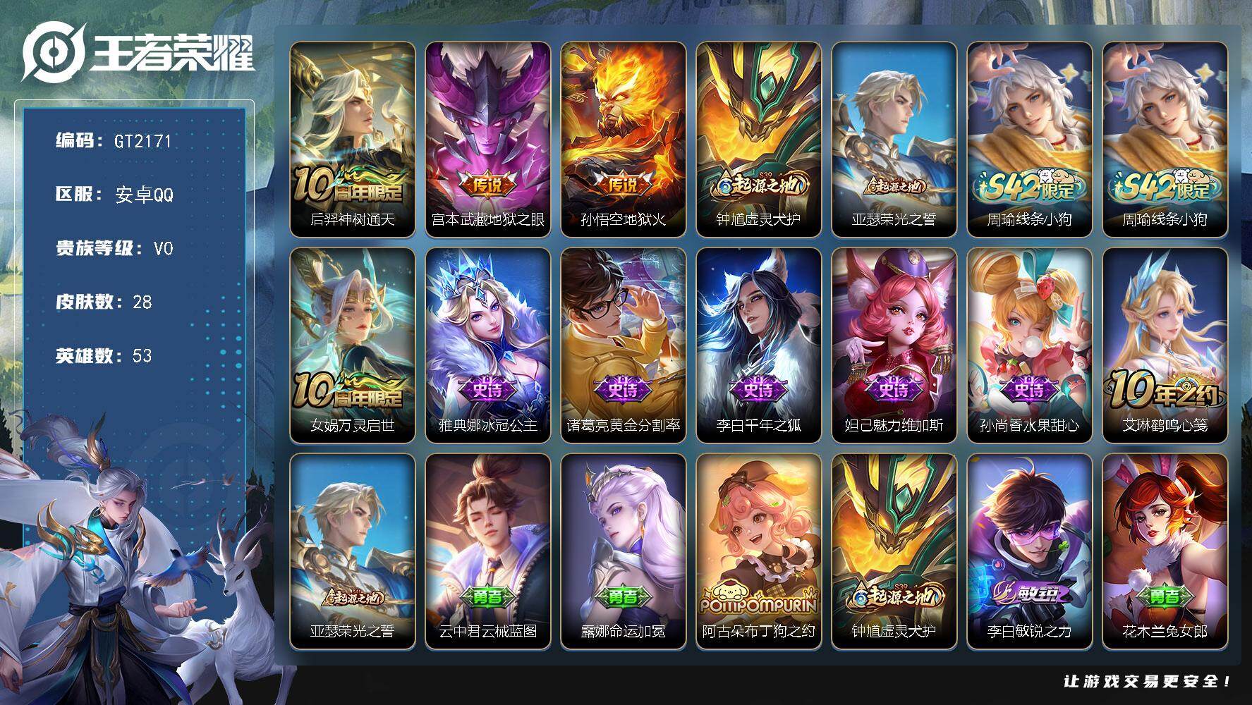 安卓Q-V2-尊贵铂金IV段位-92英雄-51皮肤-6传说-14史诗【传说皮