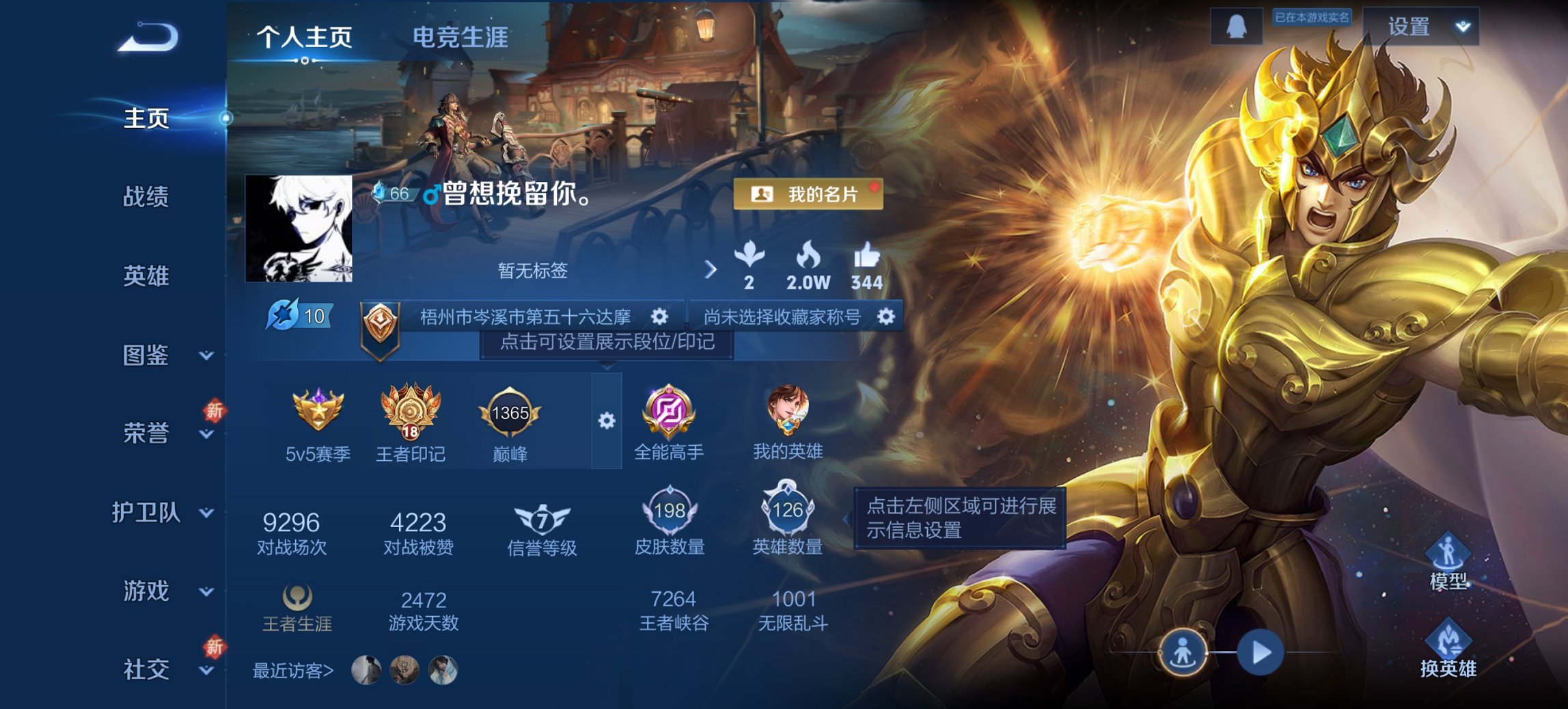 实名: 可修改 贵族等级: V6 英雄数: 72 皮肤数: 68 传说皮: 冠