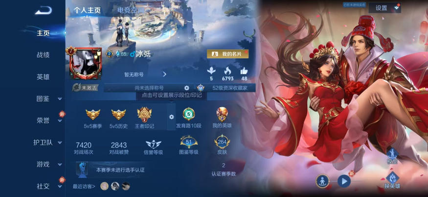 实名: 可修改 贵族等级: V5 英雄数: 124 皮肤数: 177 荣耀水晶
