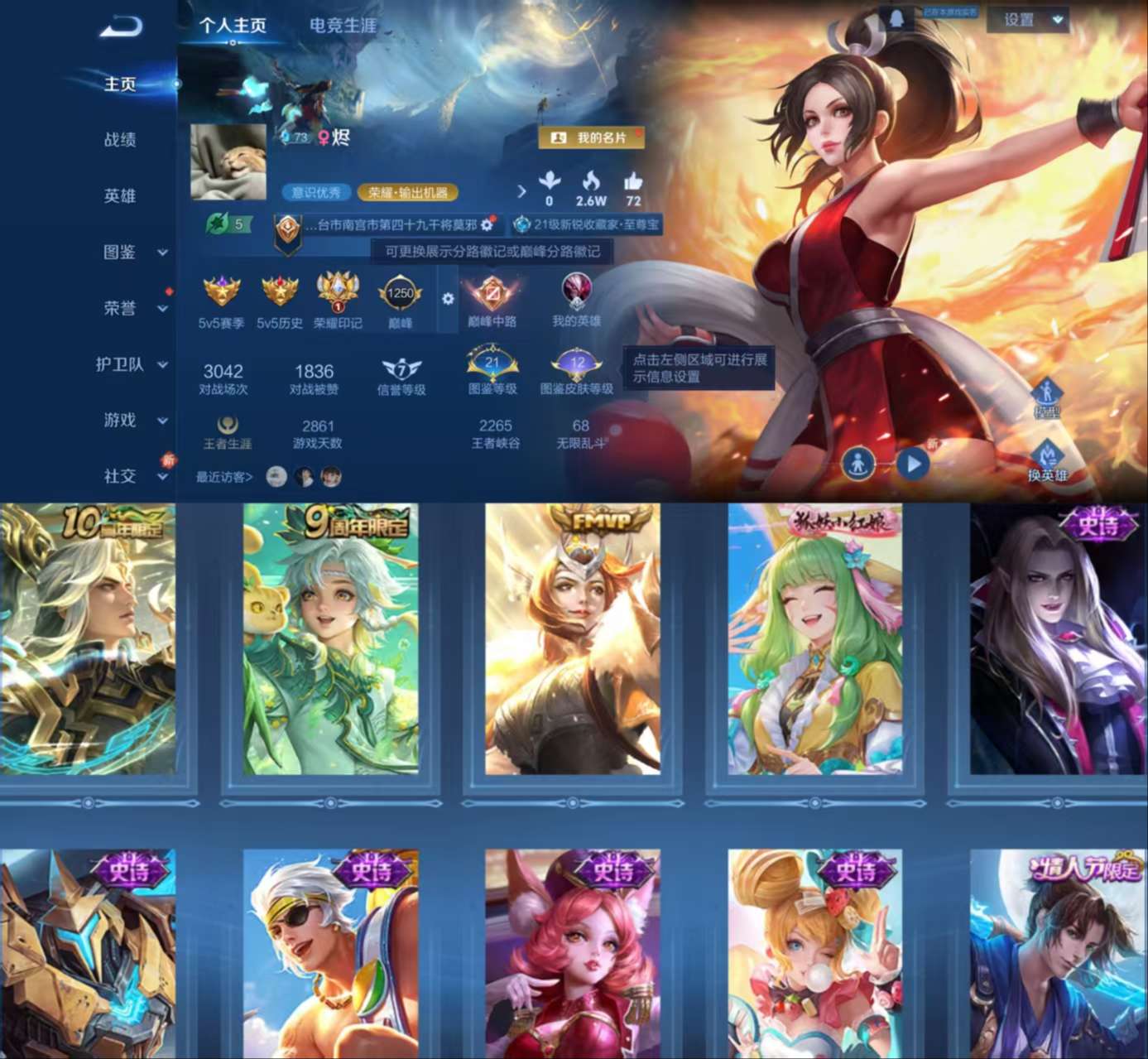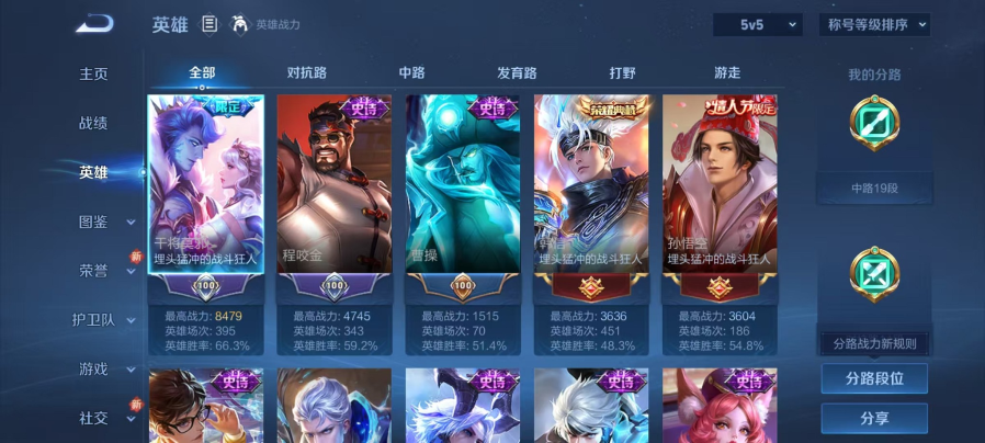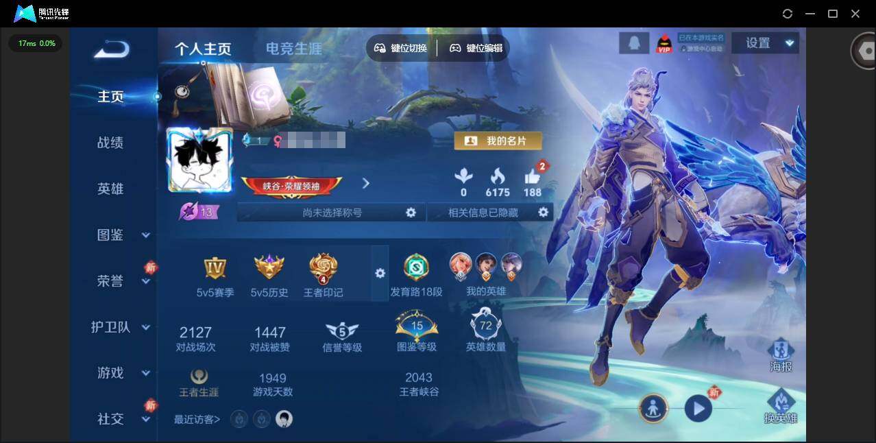 实名: 可修改 贵族等级: V6 英雄数: 72 皮肤数: 68 传说皮: 冠