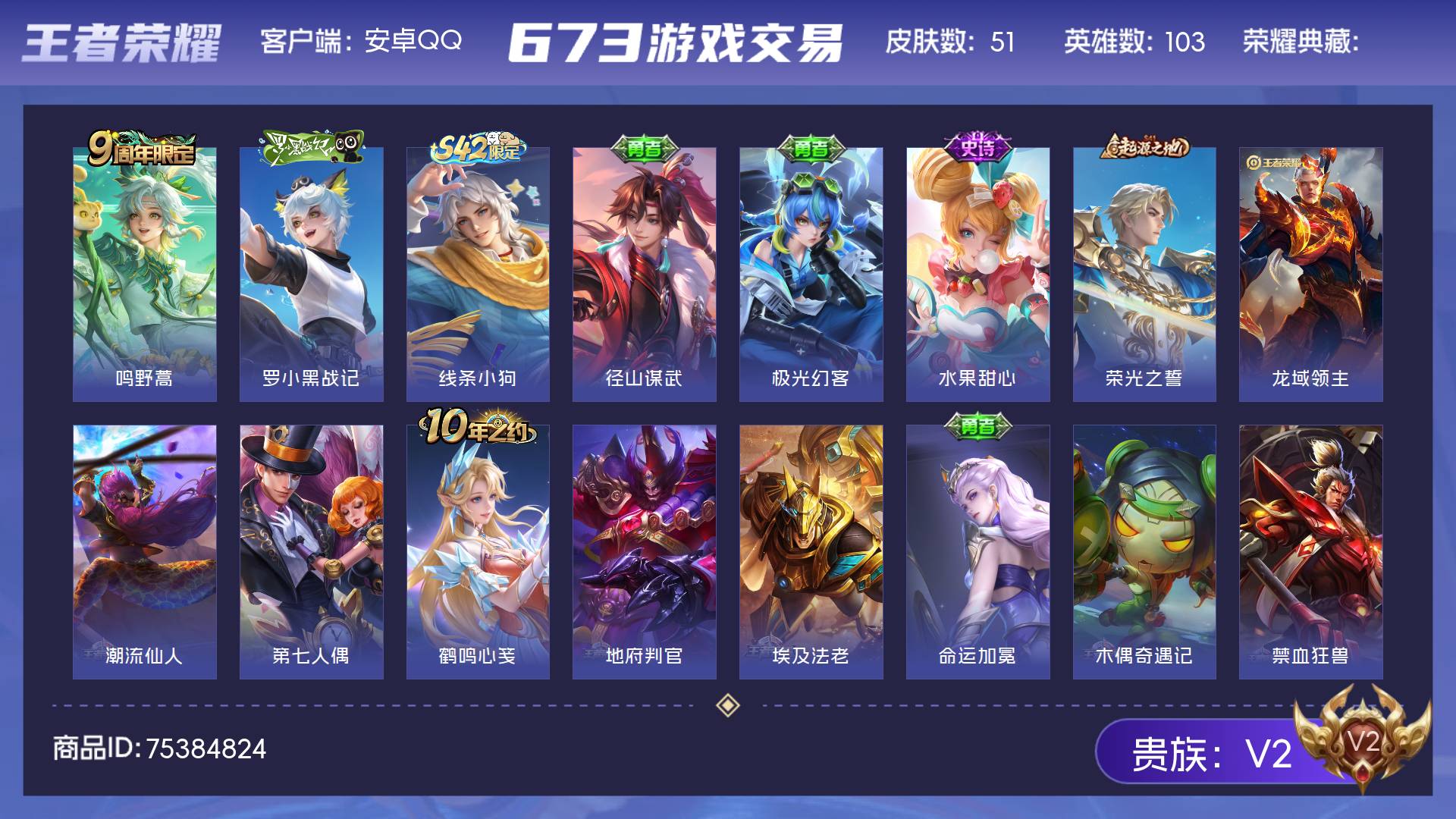 V2 皮肤51 英雄103 至尊星耀 传说1 其他皮肤55
