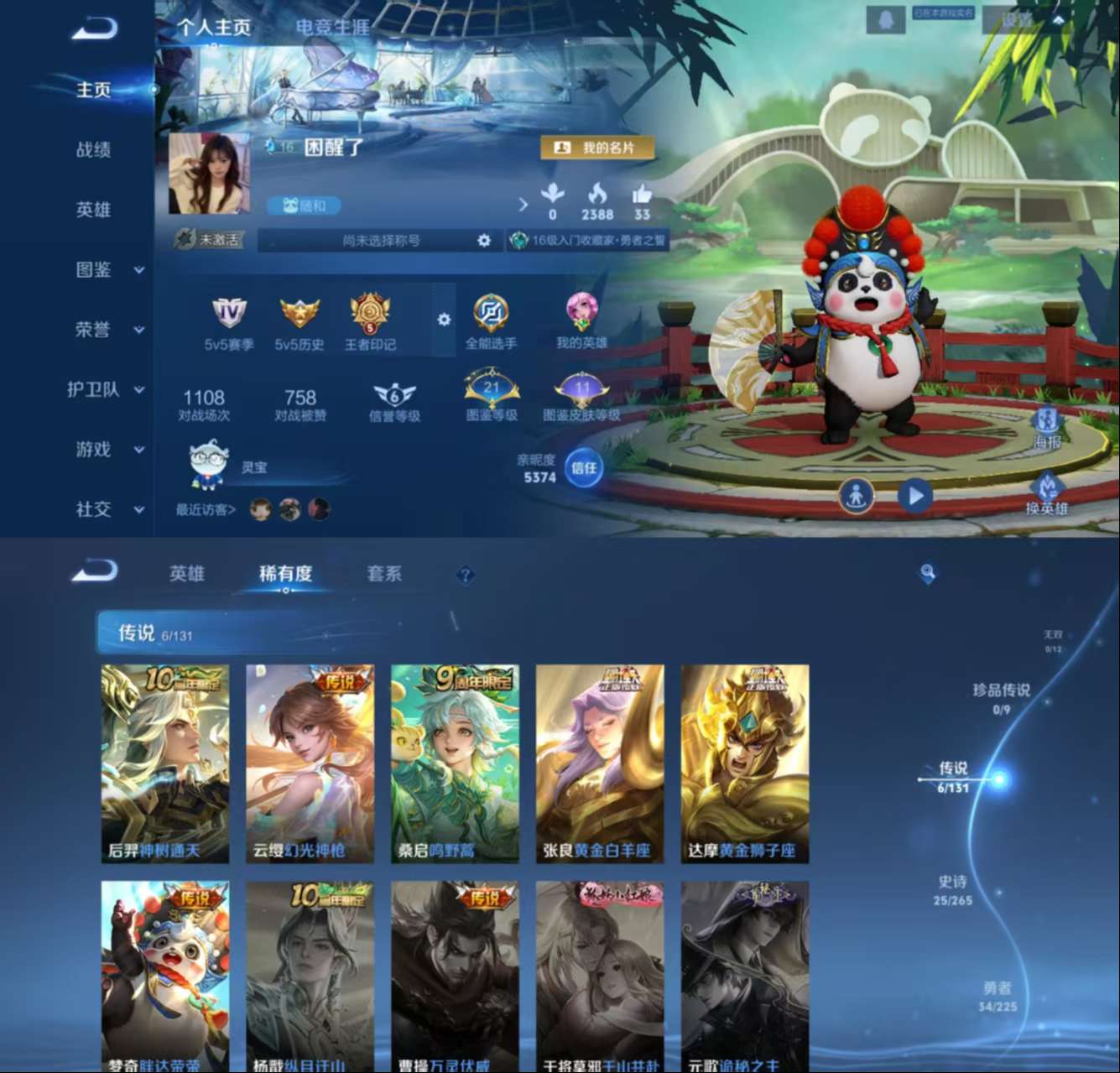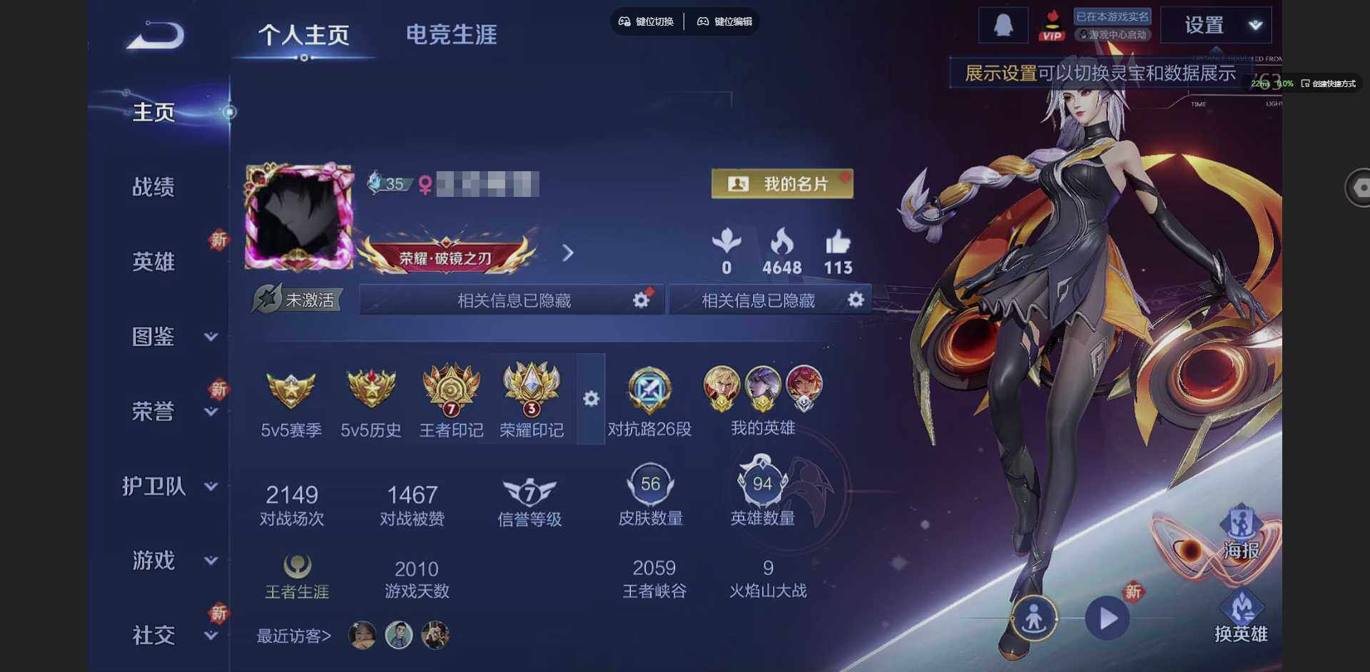 【金标李信 金标镜】贵族等级: V4 英雄数: 94 皮肤数: 56 传说皮:
