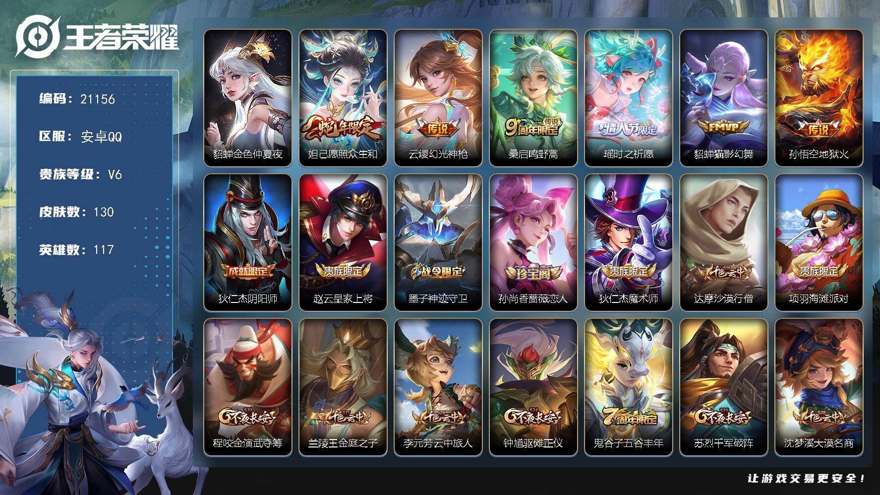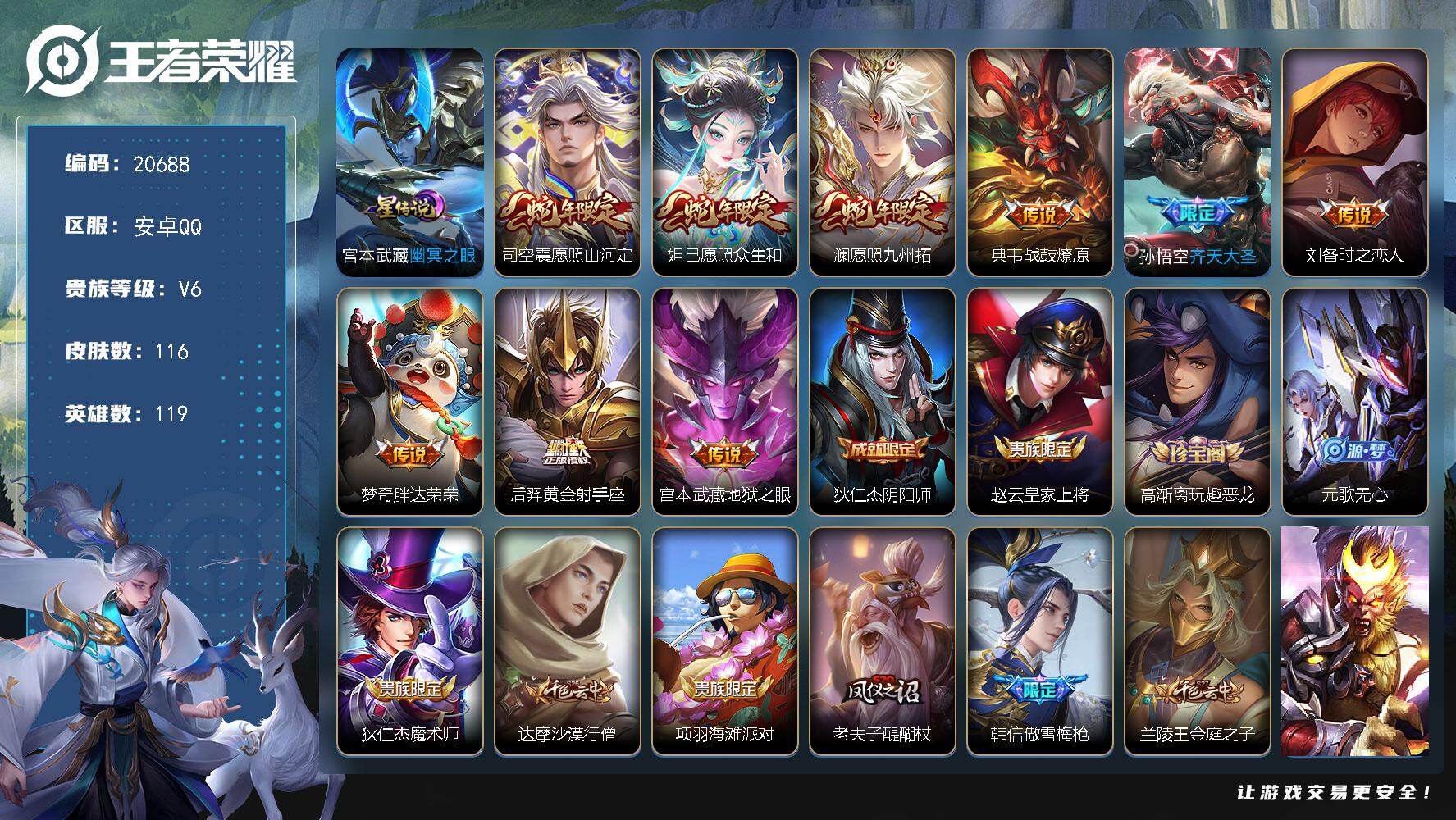 王者安卓QQ贵7,123英雄,171皮肤,总价值109640,10个传说皮,无防沉迷可二次实名可小刀
