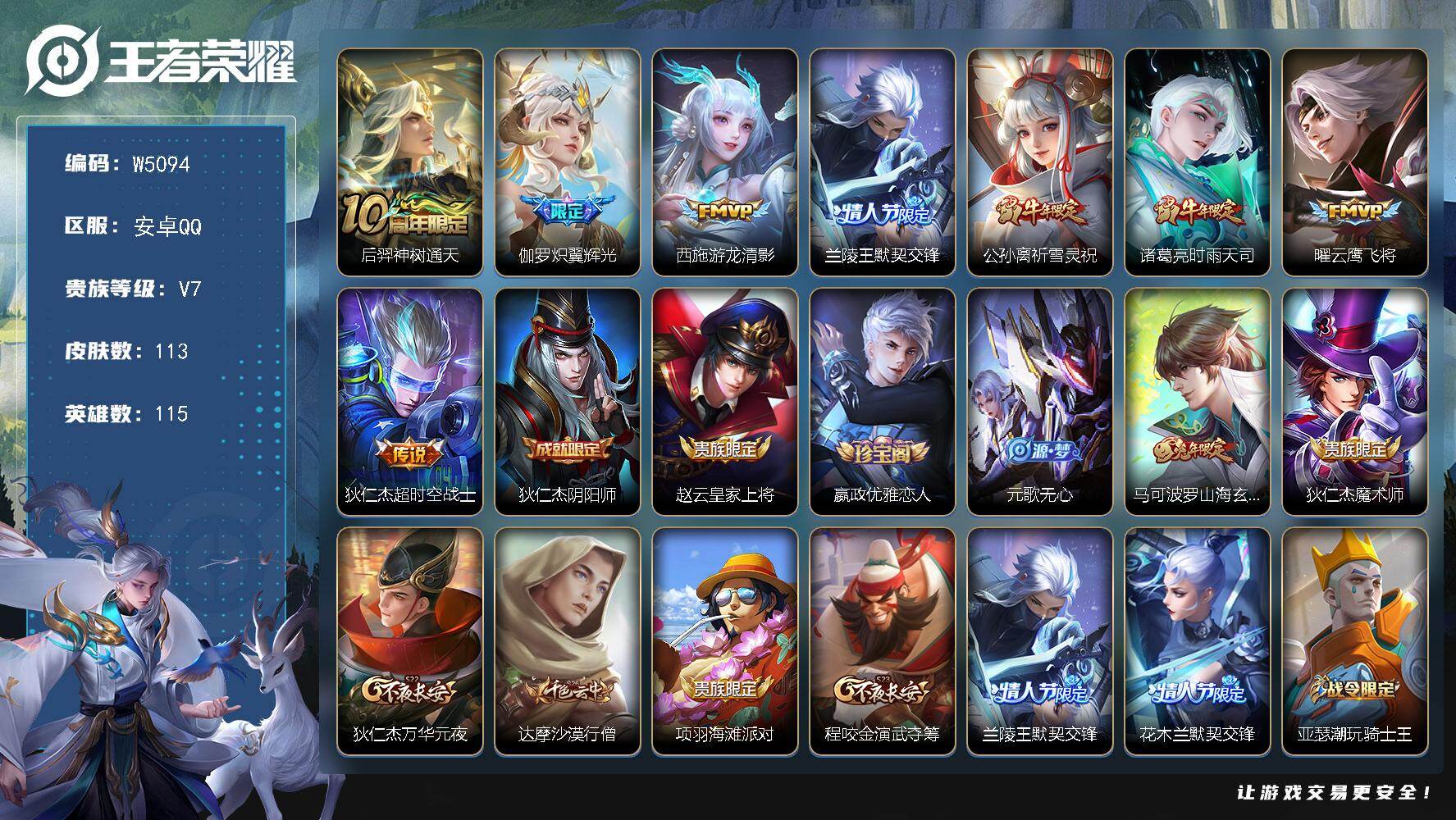 【W5094】安卓QQ-无二次-贵7-115英雄-113皮肤-8传说-38限定