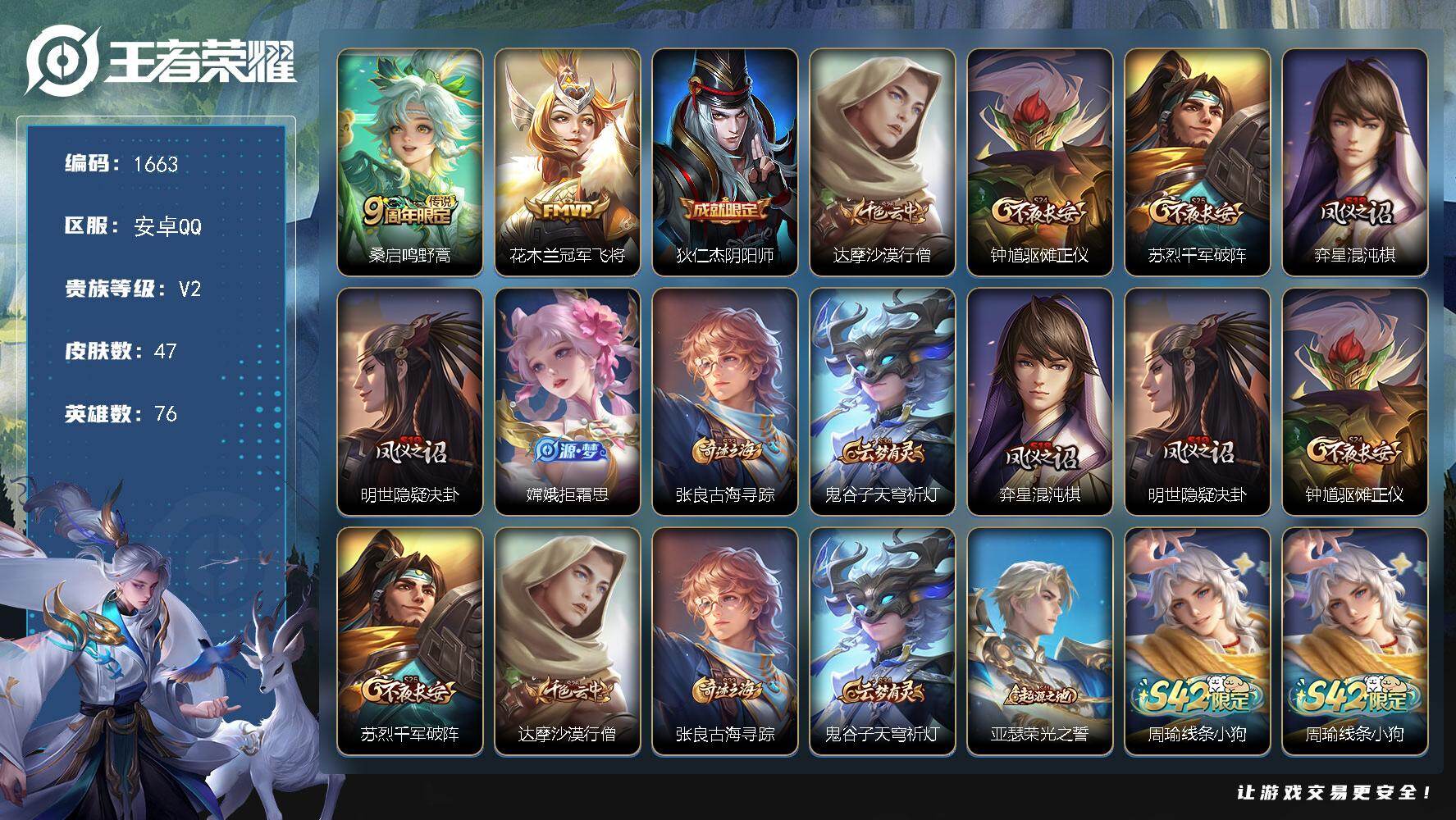 2693664 王者荣耀账号 安卓Q-V2-永恒钻石V段位-76英雄-47