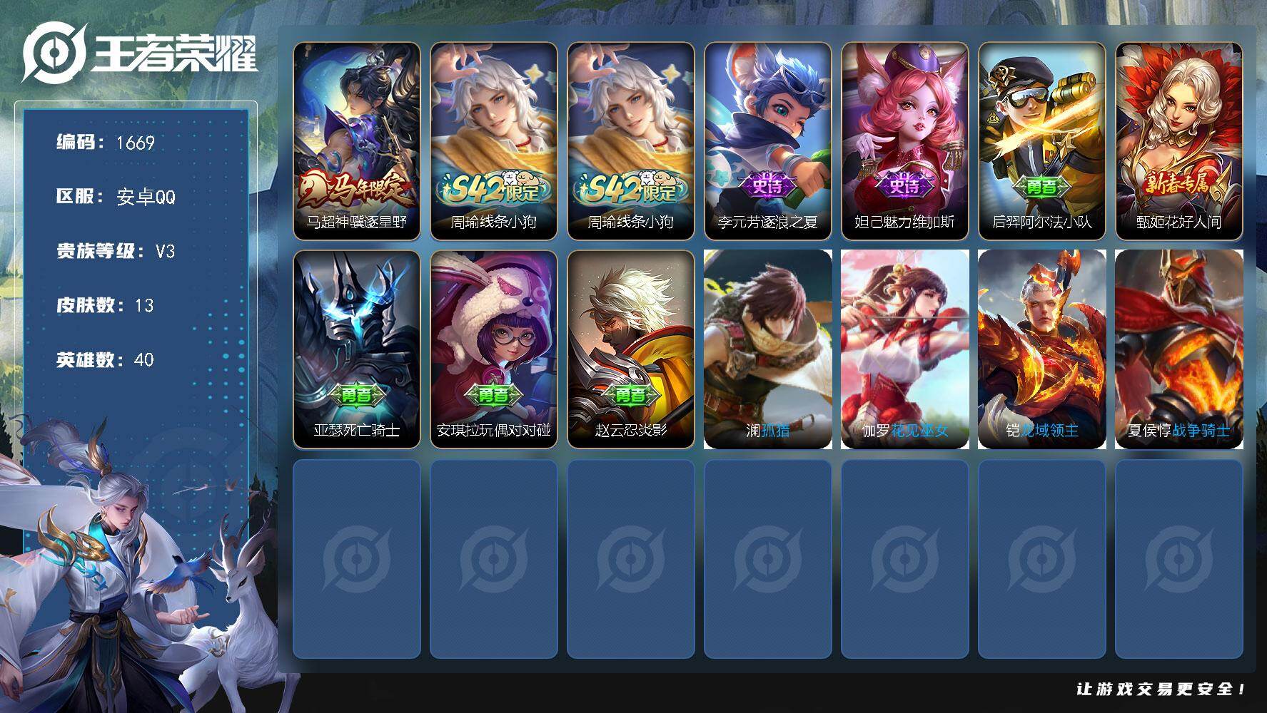 2697953 王者荣耀账号 安卓Q-V3-永恒钻石IV段位-40英雄-13皮