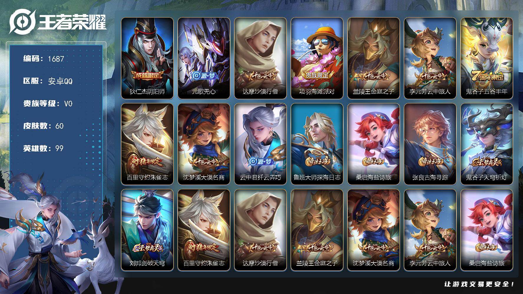 2709958 王者荣耀账号 安卓Q-V0-荣耀黄金IV段位-99英雄-60