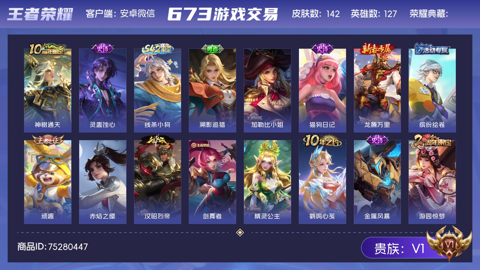 V1 皮肤142 英雄127 至尊星耀 传说1 其他皮肤147