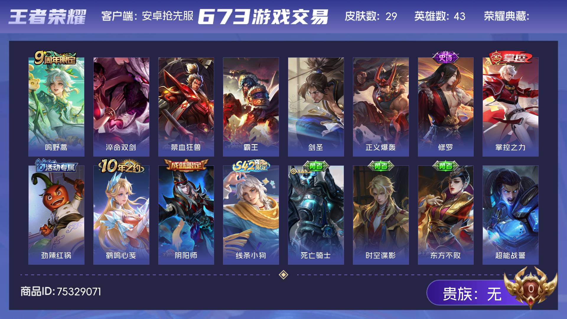 皮肤29 英雄43 非凡王者 传说1 其他皮肤33