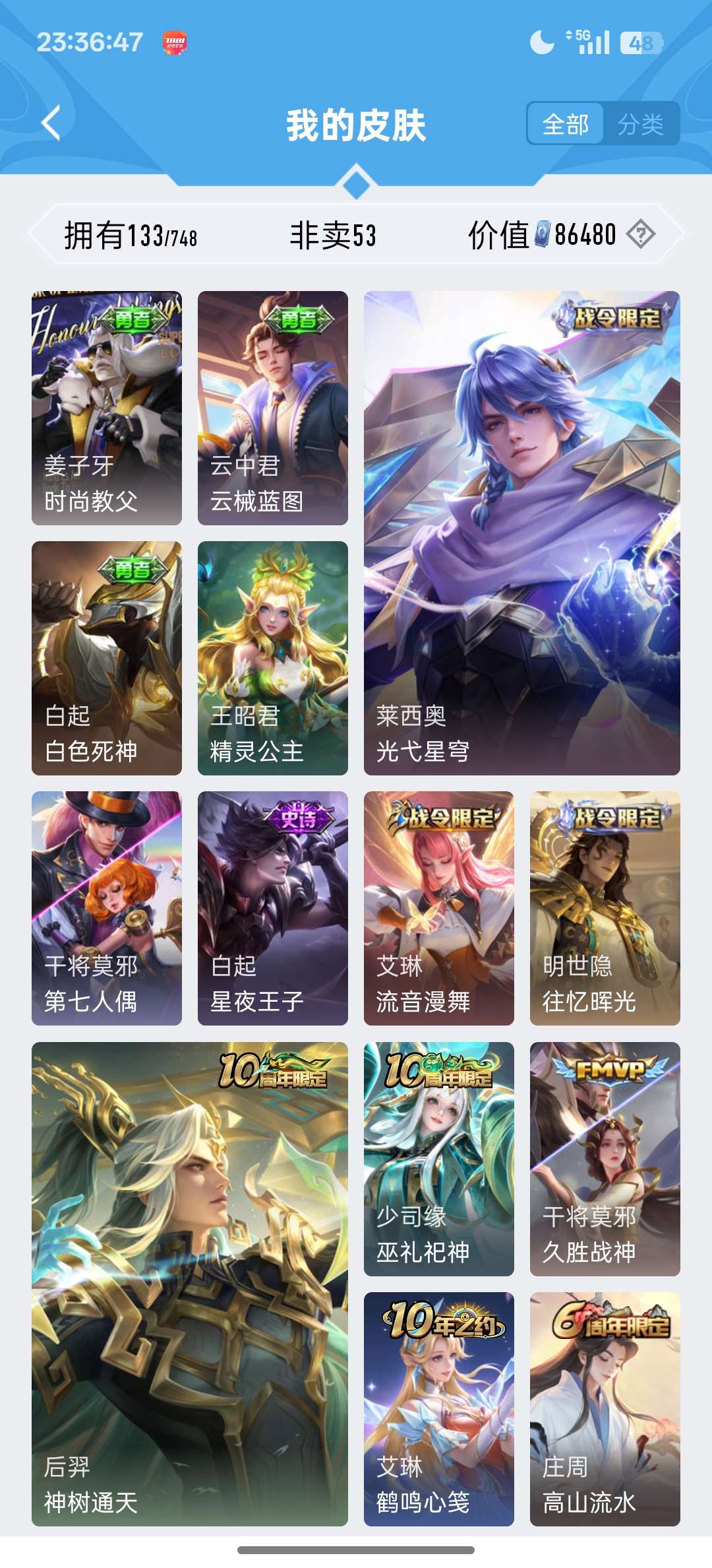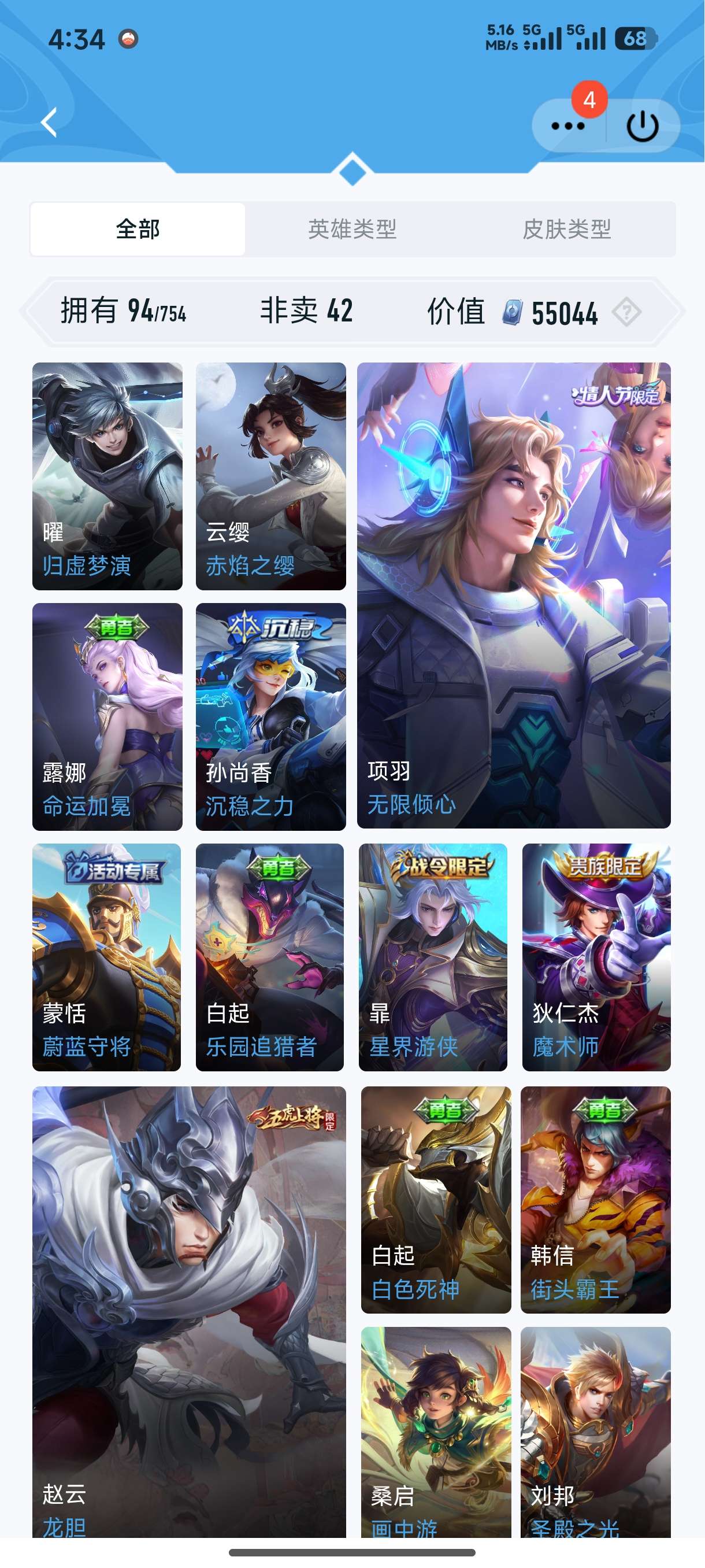 安卓Q-V5--122皮肤-1典藏皮肤-6传说-34史诗-1星传说【荣耀典藏