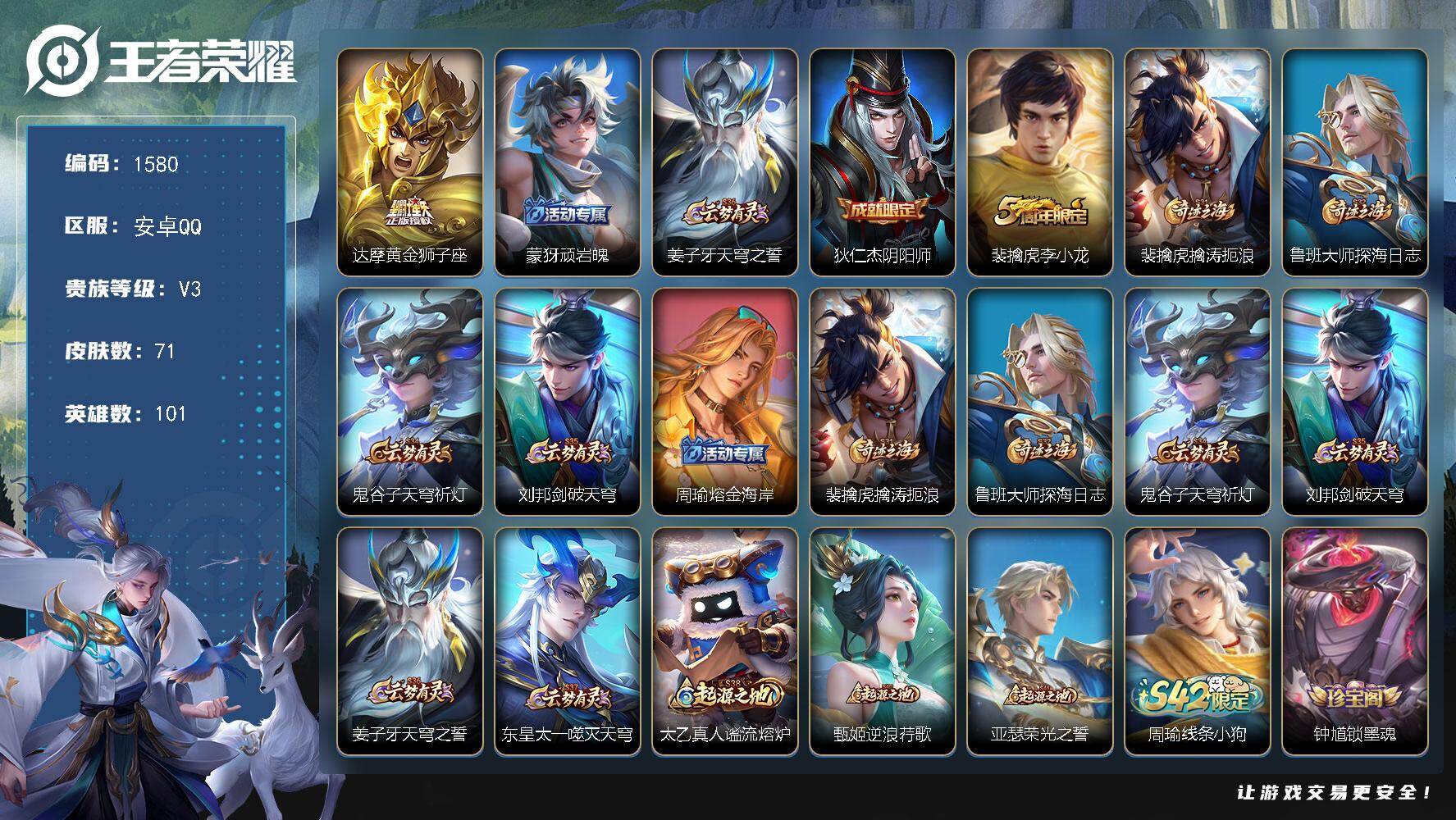 2593825 王者荣耀账号 安卓Q-V3-永恒钻石V段位-101英雄-71皮