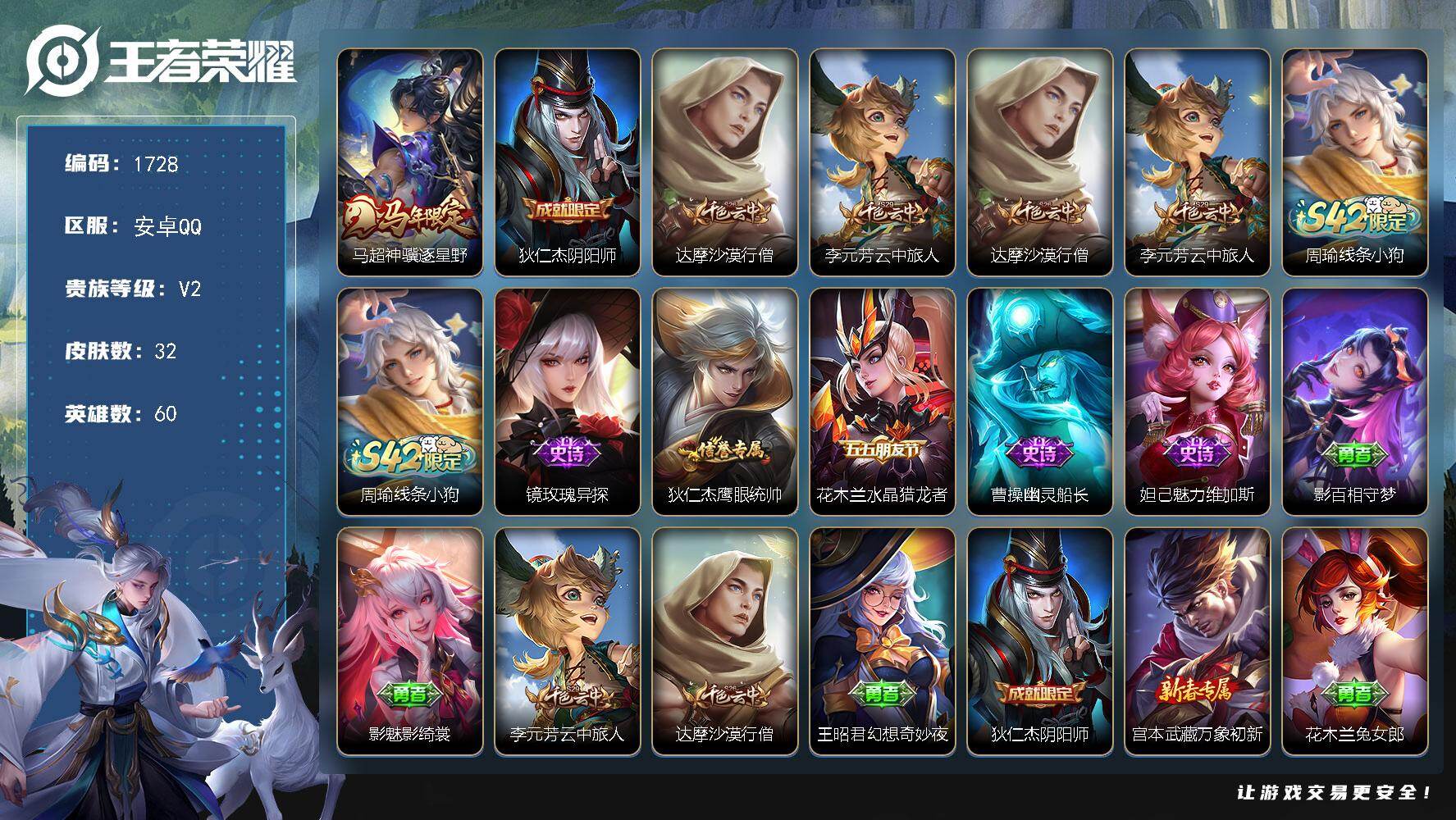2759087 王者荣耀账号 安卓Q-V2-至尊星耀V段位-60英雄-32皮肤