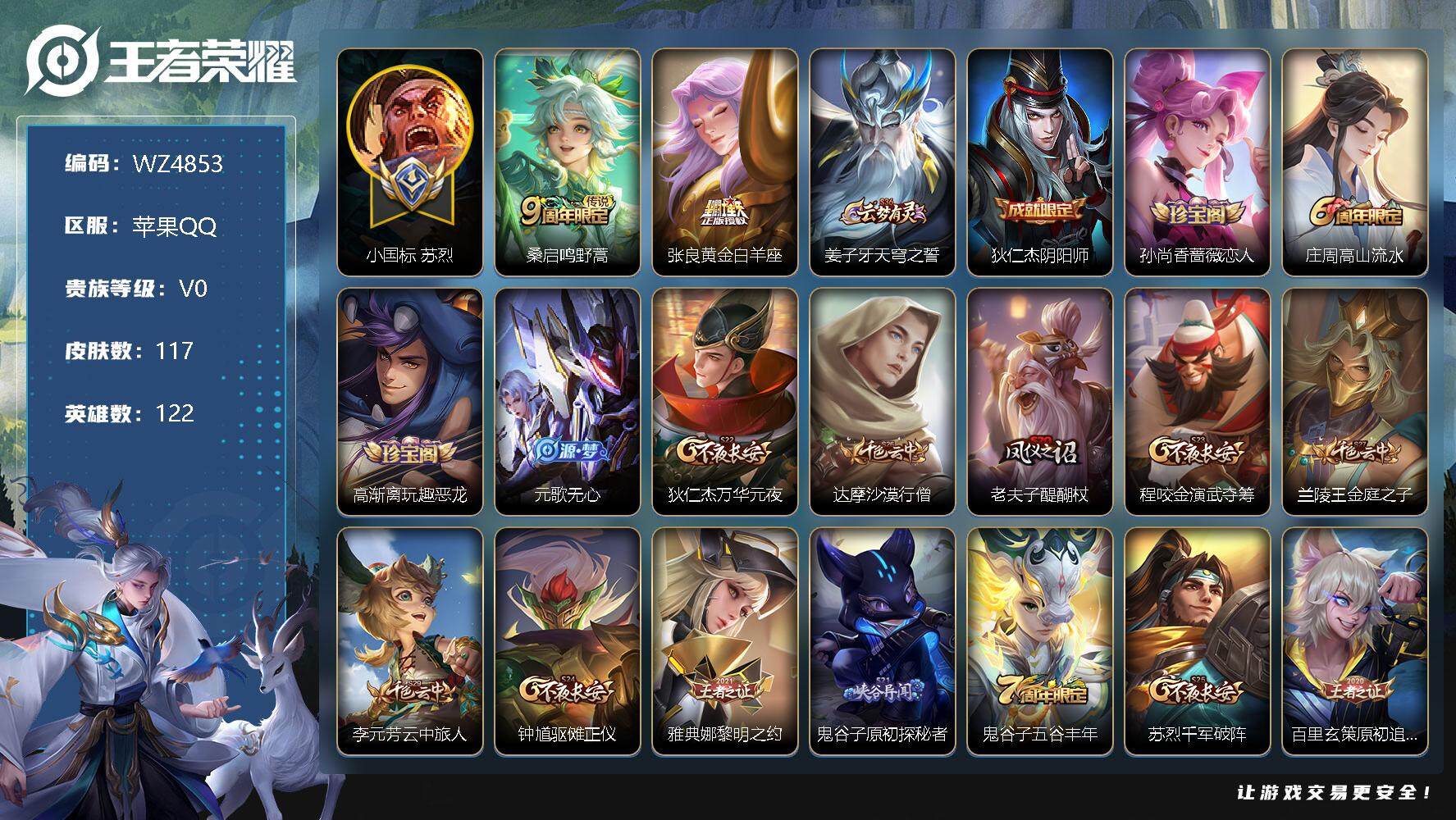 【商品标题】:苹果Q-V0-荣耀黄金I段位-122英雄-117皮肤-0典藏-0