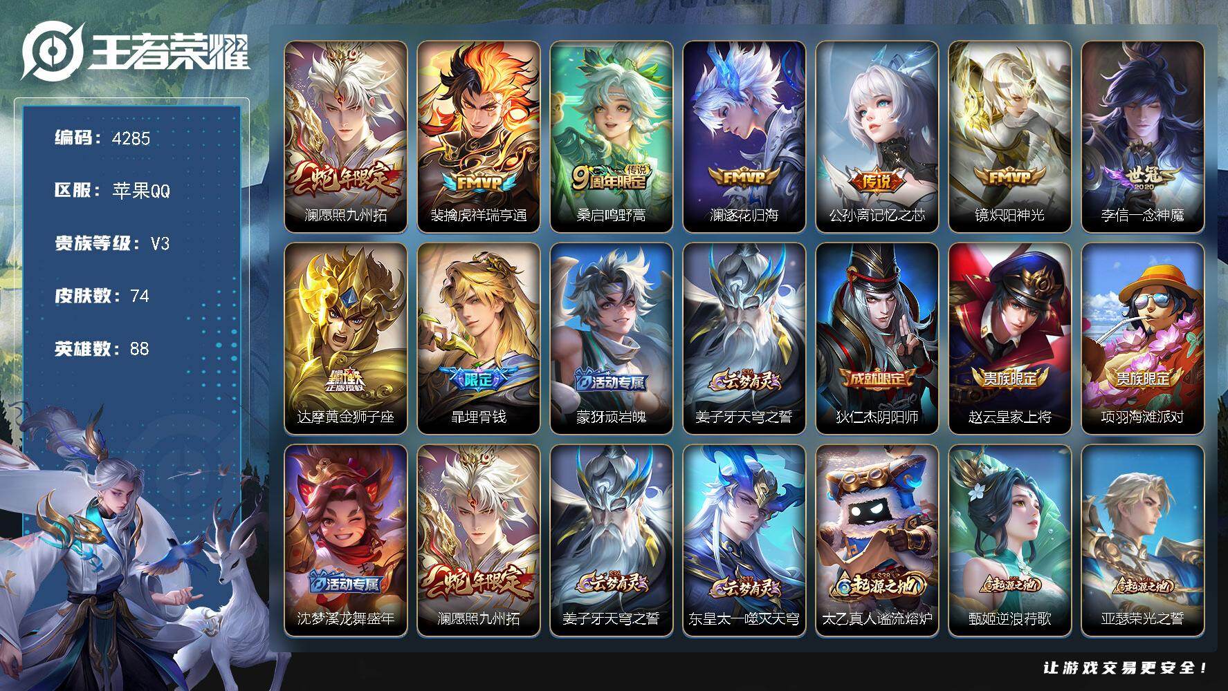 苹果Q-V3-永恒钻石III段位-88英雄-74皮肤-8传说-25史诗【传说